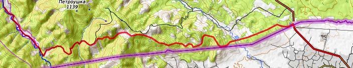 Dychtynez - nach S Straßenbrücke über den Dychtynez-Fluss - vor Kirche und Friedhof auf den Fahrweg nach links und Richtung O auf dem Bergrücken - Fahrweg wird zu Feldweg, später Fußpfad bzw. Waldweg - hoch bis zum Kamm - Rakowa (1287 m) - hier nach rechts und auf dem fast durchgehend bewaldeten Bergkamm auf Waldwegen, teilweise weglos Richtung SW - nach etwa 7 km durch Wald, der nur von wenigen kleineren Hochweiden unterbrochen ist, wendet sich der Bergkamm Richtung O /NO, dann SO - durch riesige Waldraubbau-Kahlschläge hinunter ins Tal des Sereth / Siret, das wir in der Nähe der Quelle des Sereth erreichen - nun auf den Forstwegen entlang des Sereth, begleitet von Kahlschlägen, nach Dolischnij Schepit (Übernachtung?)