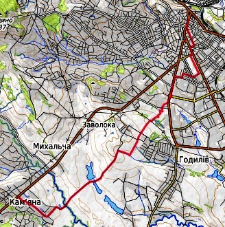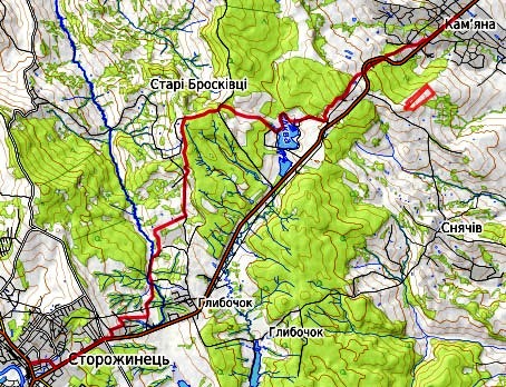 Storoschynez - auf der Czernowitzer Straße stadtauswärts - an der Tankstelle am Stadtrand, die Straße knickt leicht nach rechts, links ab und gleich wieder nach rechts - im Bogen nach N - nächster Weg rechts, nächster links, nächster rechts - nächster links - nun 2,2 km auf Feld-, Wald- und Wiesenwegen Richtung N - an der Weggabelung Richtung NO zur Fahrstraße - nach links, 900 m Richtung N - nach rechts, Feldweg zum Waldrand - hier nach links und auf dem Fahrweg 1,2 km Richtung N - nach rechts, Waldweg Richtung O - nächsten Fahrweg queren und weiter Waldwegen und Pfaden leicht abwärts Richtung SO zum Wasserspeicherbecken mit Freizeitgelände - die Seen im Norden umgehen - nach O Richtung Straße - kurz vor der Einmündung nach links und auf Feldwegen und Pfaden am Waldrand 1,4 Richtung NO - Straße queren, NO-Richtung, dabei Kurve abschneiden - am Friedhof wieder Straße queren, nördlich um den Friedhof und weiter auf Fahr-und Fußwegen Richtung NO zum Ortszentrum von Kamjana (Übernachtung?, Bushaltestelle)