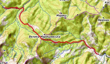 Sportywna Basa Sarosljak - auf der Talstraße entlang des Pruth etwa 1,8 km talabwärts bis zu einer Unterstandshütte - hier rechts in den Wald und auf dem Pfad bergan bis unterhalb der Mala Maryschewska (1452 m) - Richtung SO, lange Zeit in einer Höhe von 1300 bis 1400 m, meist über blumenreiche Hochweiden - Polonyna Maryschewska - Richtung O durch den Wald allmählich abwärts ins Tal von Bystrez - auf dem Talweg talabwärts - nach etwa 2 km Übernachtungsmöglichkeit in der Huzulensiedlung Bystrez (Übernachtung)