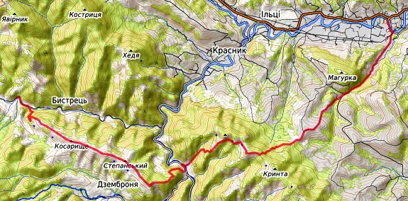 Bistrez - wenige 100 m auf dem Tal-Fahrweg talabwärts - rechts über ein Brücklein - in großen Kehren im Wald aufwärts zu den Hochweiden - immer aussichtsreich auf dem Hügelkamm Richtung SO - Kosaryschtsche (1148 m) - links unterhalb des Pfades liegt die Chatka u Kuby - Stepanskyj (1121 m) - rechts unterhalb des Weges liegt das kleine Hausmuseum Marichky - nach etwa 600 m nach links und Richtung O, später NO hinunter ins Tal des Schwarzen Tscheremosch nach Bilyj Slon (Bushaltestelle) - auf der Straße nach links - nach 200 rechts über die Brücke und in dem Seitentälchen aufwärts Richtung NO durch den Wald zur Polonyna Dowha - auf dem Kamm Richtung SO - Polonyna Hromadska - auf dem Sattel zwischen dieser Polonyna und dem Krynta (1359 m), etwa 600 m nach der Hütte auf der Polonyna, nach links abwärts in den Wald Richtung NO, zunächst auf dem Seitenkamm, später hinunter in das Tal, das bei Werchowyna in den Schwarzen Tscheremosch mündet - kurz nach links - über die Brücke ins Ortszentrum - Werchowyna (Übernachtung, Bushaltestelle)