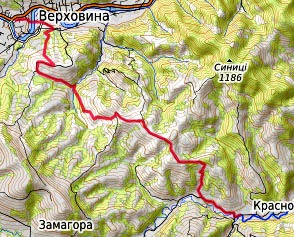 Werchowyna - vom Ortszentrum auf Fußwegen Richtung O zur wackligen Fußgänger-Hängebrücke über den Schwarzen Tscheremosch - geradeaus weiter zum Ortsrand - nach den letzten Häusern vom Fahrweg nach rechts abbiegen und auf einem Naturweg nach SW, später SO, dann nach S zum Funkmast - dem Fahrweg Richtung W folgen, aussichtsreich, im Bogen leicht abwärts - an der nächsten Wegkreuzung geradeaus weiter- leicht abwärts ins nächste Tälchen - die Häuser nördlich umgehen - über den Bach - am Gegenhang Fahrweg Richtung S - nach den Gebäuden auf dem Grasweg weiter - durch das Wäldchen - danach links - nun Hauptrichtung O auf Naturwegen, später Fahrweg Richtung SO - Krasnoillja (Übernachtung?)