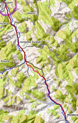 Schepit - auf der Straße entlang des Suceava-Flusses Richtung SSO zur ukrainisch-rumänischen Grenze - im Grenzbereich Grasweg, Grenzsperren, Grenzübertrittsformalitäten vorher klären, der Übergang kann gesperrt sein oder nur mit Sondergenehmigung benützt werden - der Grasweg wird zum Fahrweg, schließlich zur Straße - durch die Streusiedlung Izvoarele Sucevei - nach etwas mehr als 5 km, kurz nach der letzten Brücke über den Suceava Fahrweg nach rechts - gleich nach den beiden Gehöften verlassen wir den Fahrweg und gehen nach links über die Wiesen und Weiden aufwärts - z. T. weglos Richtung SO, dabei überqueren wir die Wasserscheide zwischen Suceava und Moldova - nach dem nächsten Gehöft wieder ein Fahrweg, der abwärts zur Straße führt - auf der Straße nach Moldova-Suliţa (Übernachtung, Bushaltestelle)