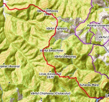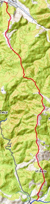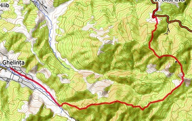 Ghelinta - vom südlichen Ortsrand auf Feld- und Waldwegen in Richtung S zunächst durch den Wald, dann über Hochweiden aufwärts zum Vf. Valosul Mic - immer in etwa S-Richtung beibehalten, immer möglichst auf dem Bergkamm bleiben - W/S um den Vf. Fagul Curat / Tistobic - weiter Richtung S - Poiana Iacob - Pilisul Covasnei - Vf. Barta - links hinunter zum Manastirea Prodromita und zur Talstraße nach Comandau (Übernachtung)