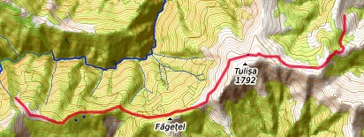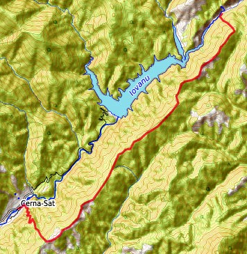 Vom Endpunkt der der gestrigen Etappe etwa 1,2 km auf dem Talweg Cerna abwärts - nach links und auf Waldpfaden auf den linksseitigen Bergkamm - oben auf der Hochfläche nach rechts Richtung SW - nach etwa 1 km einen Taleinschnitt queren - nach weiteren 2 km, zunächst auf der Hochfläche, dann auf dem SO-Hang, den steinigen Hang Richtung W queren - auf dem Grat hinunter ins Cerna-Tal - auf dem Talweg ca. 100 m nach rechts - nach links über die Cerna-Brücke Iauna - sofort wieder nach links, zunächst Forstweg, dann Waldpfad geradeaus weiter, ca. 50 m über der Cerna, talabwärts - hinunter zu den Wiesen an der Cerna - rechts der Cerna auf Pfaden und Feldwegen zu den Cabane Deea Montana in Tatu (Übernachtung)