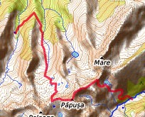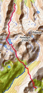 Refugiul Stana de Rau - Markierung roter Punkt - Portile Inchise - nach links, Markierung rotes Band - Wegweiser unterhalb des Vf. Papusa (kurzer Abstecher zum Vf. Papusa 2508 m möglich, Markierung gelbes Kreuz, wieder zurück zum Wegweiser) - Markierung gelbes Kreuz und rotes Band - Saua Pelegii (Abstecher zum höchsten Gipfel des Retazat möglich, Vf. Peleaga 2509 m, zurück zur Saua Pelegii) - Markierung gelbes Dreieck - im Wald Wegweiser nach links, Markierung rotes Kreuz - Cabana Gentiana (Übernachtung in einfacher Berghütte, nur Getränke, kein Essen)