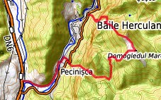 Bei den Campingplätzen in der Nähe des großen Thermalbads beginnt der Wanderweg auf den rechtsseitigen Bergkamm, Markierung gelbes Dreieck - auf dem Kamm nach links, Markierung rotes Band - am südlichen Ende der Hochweide Poiana cu Peri der Markierung blaues Dreieck in Richtung SSO abwärts folgen - in etwa 350 m Höhe nach links Richtung Izvorul Munk - nach rechts hinunter ins Zentrum des alten Kaiserbades Baile Herculane (Übernachtung, Bushaltestelle)