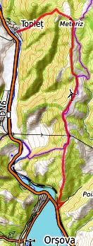 Toplet - an der Straßenkreuzung in der Ortsmitte am Pfarrhaus vorbei in die Straße Richtung NO - weiter auf Vieh- und Waldpfaden in dieser Richtung aufwärts zu den Hochweiden - hier nach rechts zum Vf. Meteriz mit Funkmasten - wenige Meter danach treffen wir auf den Kamm-Fahrweg - hier nach rechts und auf dem aussichtsreichen Kamm Richtung S - Vf. Dranic - wir passieren zwei Windkraftanlagen - wir bleiben auf dem Kamm Richtung S/SSW (der Fahrweg verlässt den Kamm nach links abwärts) - auf unserem Pfad über die Hochweiden genießen wir eine grandiose Aussicht auf den Donaudurchbruch am Eisernen Tor - der Bergkamm senkt sich allmählich ab, auf Pfadspuren hinunter zur Str. Valea Slatnicului - hier nach rechts zur Donau in der Nähe des Bahnhofs Orsova. Ins Zentrum dann über die Brücke über die durch den Aufstau der Donau stark verbreiterte Cerna-Mündung (Übernachtung, Bahnstation, Bushaltestelle)