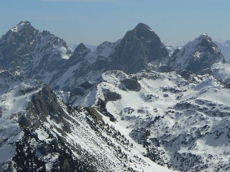 Unser Ziel: Der Aggenstein Mit jedem Höhenmeter wird die Aussicht eindrucksvoller: Tannheimer Tal und Hochvogel Der Gipfelanstieg. Oben das exponierte Schneefeld (Vorsicht!)