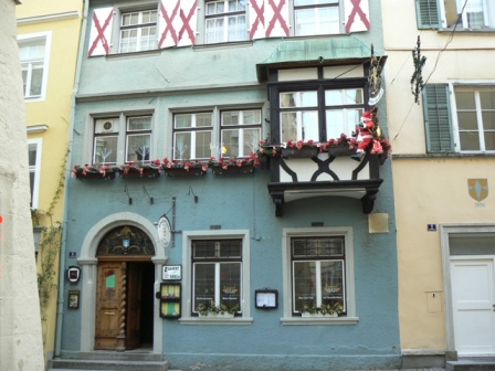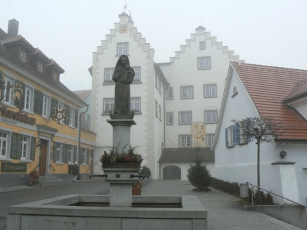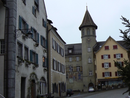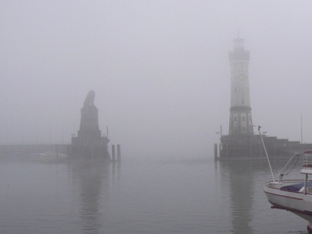 Ungewohnt pünktlich bringt mich die Schwäb'sche Eisenbahn nach Meckenbeuren. Vom klaren Himmel der Schwäbischen Alb in die graue Nässe der Bodenseenebel! Aber gute Wegmarkierungen (übrigens auf der ganzen Strecke bis Thusis) und die Erkenntnis, dass die heutigen Wanderwege meistens auf römischen und mittelalterlichen Trasse geführt sind, erzeugen dennoch eine gute Wanderstimmung, als es durch Intensiv-Obstplantagen (kräftig mit Herbiziden entkrautet) und Hopfengärten zur alten Residenzstadt Tettnang mit ihren Montfort-Schlössern geht. Anschließend ist Wald und Moor angesagt. Rasten ist schwierig: Alle Gasthäuser sind geschlossen! Aber die Landschaft wird interessanter, und am Degersee scheint endlich die Sonne. Durch bucklige Drumlin- und Grundmoränenlandschaft wird in Bad Schachen der Bodensee erreicht - und der Nebel und die Kälte schlagen wieder zu. Damit bin ich auch am Ziel der ersten Etappe, in Lindau, der Inselstadt im Bodensee. Nach einem Rundgang zu einigen der Sehenswürdigkeiten mache ich mich auf die Suche nach einer Unterkunft für die Nacht. Der Gasthof Engel in der Altstadt in einem sehr schönen historischen Gebäude empfängt mich gastfreundlich. Leider ist die Luft in der Gaststube für einen Weitwanderer unerträglich verraucht. Wann endlich kommt das Rauchverbot in Deutschland?