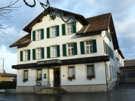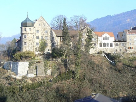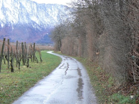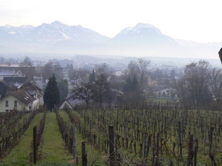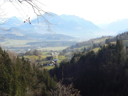 Wieder ein Traumwetter! Aber mein Weg liegt bis zum Mittag im Schatten, Rauhreif und Eis erschweren das Gehen. Mein Hotel liegt direkt am alten Weg, der durch das Dornbirner Oberdorf, die eigentliche Altstadt führt. Nach der Überquerung der Dornbirner Ach verläuft mein Weg weiterhin am Hangfuß, bis der riesige Steinbruch der Firma Rhomberg und das dabei entstandene Industriegebiet das idyllische Bild stören. Aber die Österreicher haben sogar hier einen Fußweg durchgebaut! Danach gehören Weg, Wald, Seen und Bäche dem Fürsten Waldburg-Zeil. Hohenems betrete ich durch das Stadttor bei der Kirche, die Altstadt verlasse ich durch das östliche Stadttor zur Emsbachstraße und weiter entlang der Emshalde. Eine von der "Agrargemeinschaft" verfügte Umleitung wegen Steinschlaggefahr ignoriere ich. So kann ich mich mit einer geologischen Lehrtafel fortbilden und anschließend beim Steirer Wirt am Ortseingang von Götzis einkehren. Anschließend links hoch auf die "Römerstraße", am Ortskern von Götzis vorbei hinauf zum Kirchlein St. Arbogast. Oben grüßt die Ruine Neu-Montfort, ihr Nachbau neben der Straße erspart den Aufstieg. Durch die Klause geht es nach Klaus - Überraschung: Weinberge! Dann ein langer Asphalthatsch neben der Walgaustraße über Weiler, Röthis und Sulz nach Rankweil, das beherrscht wird von der Basilika auf hohem Felsen. Mein Quartier im altehrwürdigen Hotel Hoher Freschen erweist sich als Treffer - wieder mal feinste Gourmet-Küche und guter Wein, leider keiner aus Klaus.
