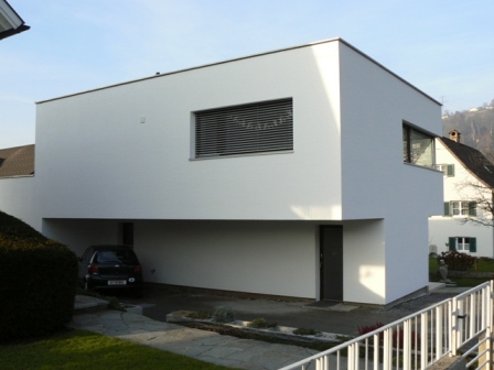 Postmoderne architektonische Scheußlichkeiten bestimmen die Dorfbilder, die alten Rheintalhäuser stehen leer und verfallen Sonnenuntergang hinter den Säntisbergen (Blick aus dem Fenster)