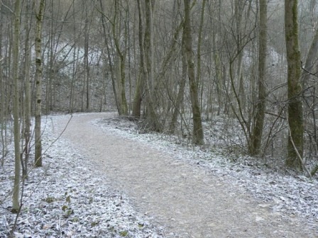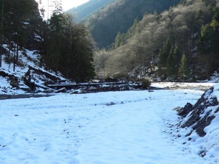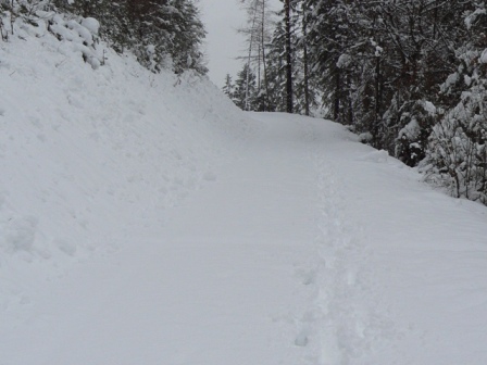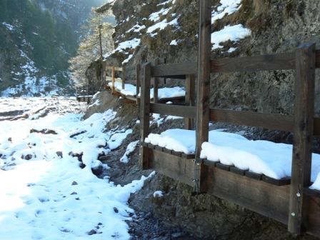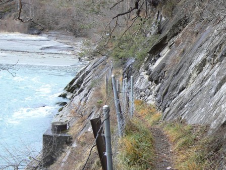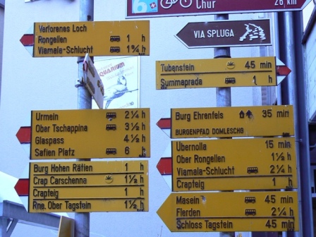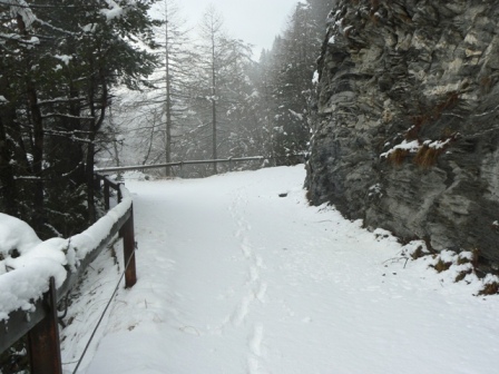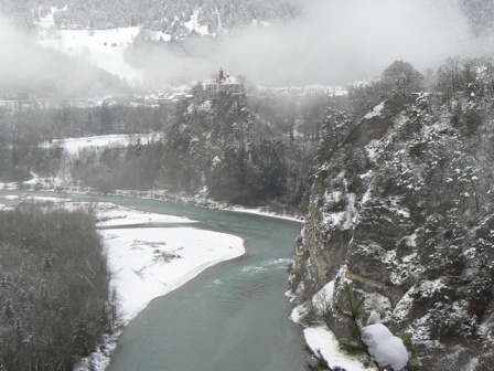 Es hat geschneit: 10 cm Matsch bedecken Churs Straßen. Aber ich habe ja bestens gefrühstückt, gut geschlafen und bin damit auf die kommenden Strapazen perfekt vorbereitet. Quer durch die Altstadt, auf der Gäuggelistraße hinaus bis zur Calanda-Brauerei, dann auf der Kasernenstraße bis an den Stadtrand, wo der Wanderweg links ins Grüne bzw. jetzt ins Weiße abbiegt. Aber gottseidank war schon ein Fußgänger vor mir unterwegs. Eine gute Wegspur gab das noch nicht, aber eine Orientierung im eintönigen Weiß. So erreiche ich bei leichtem Schneefall Domat/Ems, umgehe es durch die südöstlichen Neubaugebiete auf dem Graubünden-Radweg 6, erreiche am Ortsrand wieder den Wanderweg, der dann links hoch in den Wald hineinführt. Mit jedem Höhenmeter steigt auch die Schneehöhe. Anfangs kann ich in einer Traktor-Fahrspur gehen, aber die biegt bald ab nach Feldis. Jetzt heißt es stapfen! Kleine Lawinen sind überall am Hang abgegangen, manchmal auch Steinschlag. Bald mündet der Radweg von rechts ein, und für eine Weile gibt es wieder eine Fahrspur. Dann aber Tiefschnee, noch tiefer, noch tiefer ... Aber der Weg ist schön: Unten rauscht der Hinterrhein als echter Wildfluss, vom Gegenhang grüßen das Kirchlein S. Gieri und das Schloss Rhäzüns. Teilweise ist der Weg richtig in den Felsen hinein gehauen. Leicht abwärts erreiche ich Rothenbrunnen mit seinem stilvollen Kurhaus. Das Dorfgasthaus hat Ruhetag. Deshalb verlasse ich den Fußweg und gehe auf dem Radweg im Talboden auf dem kürzesten Weg durchs Domleschg, den an Burgen reichsten Talabschnitt des gesamten Rheins, nach Thusis am Eingang zur Via Mala, von wo aus mich die Bahn zuverlässig, pünktlich und bequem in die Heimat zurückbringt.