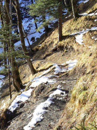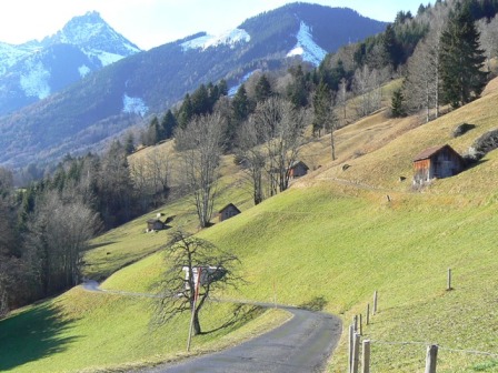 Der Nebel hat sich gelichtet, aber über dem Bodensee hängt eine Dunstglocke wie über einer Großstadt. Der Bodensee hat extremes Niedrigwasser, auf dem kleinen See zwischen den beiden Dämmen laufen die Kinder schon Schlittschuh auf dem aber noch recht dünnen Eis. Der gut bezeichnete Bodensee-Rundwanderweg entpuppt sich als Wanderer-Qual, denn er führt deutlich vor Augen, wie mit der bayerischen Landesverfassung Schindluder getrieben wird: "Der Zugang zu den Seen ist für alle offen." Denkste! Kauft ein Investor eine Ruine, kauft er gleich die Uferpromenade mit, d.h. der Wanderweg führt im Zickzack zum See und wieder weg. Teilweise wird dieses Spielchen durch protzige Autofahrer (meist im BMW) aufgepeppt: Die Uferstraße ist verkehrsberuhigt, d.h. Fußgänger gehen auf einem gekennzeichneten Teil der Straße, Hindernisse sollen die Autos bremsen. Damit der BMW aber nicht bremsen muss, rast er geradeaus über die Fußgängerbereiche, die Fußgänger üben sich im sportlichen, lebensrettenden Sprung in die Grünanlage ... Bei Lochau überhole ich eine Autoschlange. Grund: 4 Leichen liegen auf den Bahngleisen direkt neben der Straße. Ein 18-jähriger wurde frühmorgens auf dem Heimweg von einer Party von einem Zug erfasst und getötet. Kurz danach rast der Eurocity München Zürich in die Gruppe Polizisten und Bestatter, die den Unfall aufnahmen. Keiner weiß, warum der Lokführer keine Anweisung zum Langsamfahren erhalten hatte. Ein 32-jährige Polizistin, ein 63-jähriger Polizist und der 47-jährige Bestattungsunternehmer starben vor den Augen ihrer Kollegen. Grausam! In gedämpfter Stimmung erreiche ich Bregenz, gehe sofort hoch in die toskanisch anmutende Oberstadt = Altstadt, raste in der Sonne vor der alten Galluskirche, ehe es hinuntergeht ins Tal der Bregenzer Ach, die sehr wenig Wasser führt. Bei Kennelbach quere ich die Ach und gehe auf der alten Straße durch die Ortskerne von Wolfurt, Rickenbach, schau mir den Privatzoo des Skiliftherstellers Doppelmayr an und erreiche über Schwarzach und Haselstauden mein Quartier im edlen Hotel Zum Verwalter im Dornbirner Oberdorf. Essen und Wein vom Besten, Zimmer mit Ausblick ...