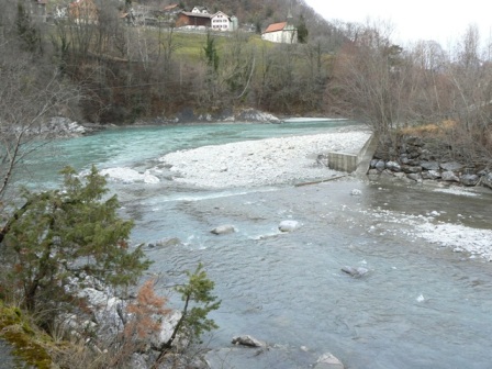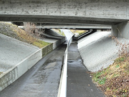 Bahn- und Autobahn-Unterquerung bei Landquart Mündung der Landquart in den Alpenrhein Dammweg am rechten Alpenrheinufer