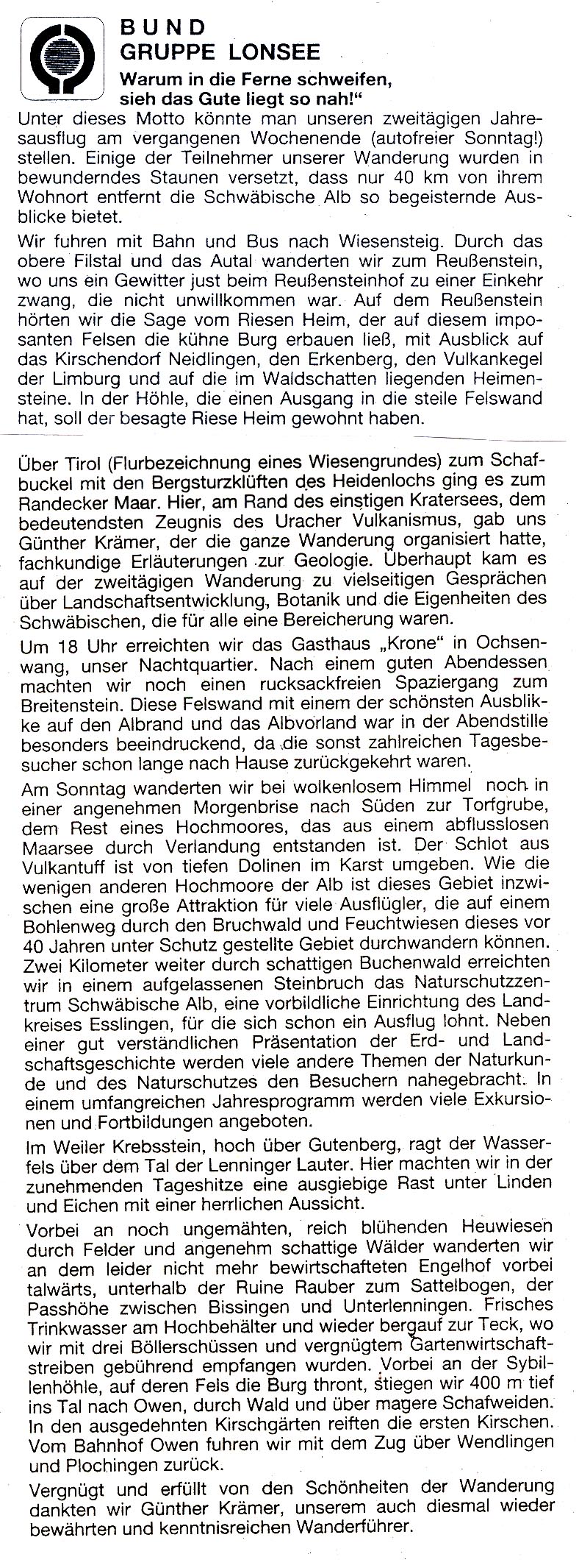 Bericht des BUND Lonsee im Mitteilungsblatt der Gemeinde Lonsee "Der Lonetalbote"