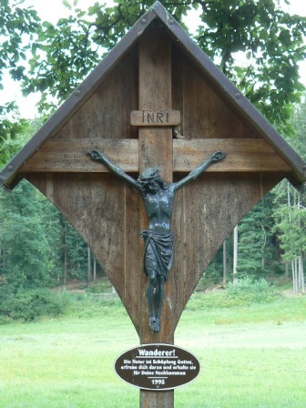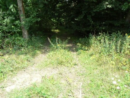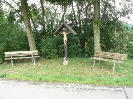 Schloss Wörth Hungersdorf: Der E 8 verlässt uns nach links, wir gehen geradeaus auf dem Rundweg 1 Altes Wegkreuz
