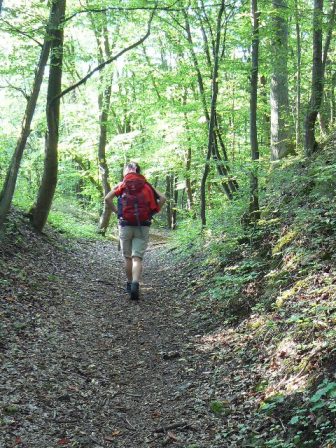 Wir wandern heute auf dem Jurasteig, einem seit 2007 mit dem Gütesiegel „Qualitätsweg Wanderbares Deutschland“ ausgezeichneten Wanderweg. Dies bedeutet, dass der Weg hohen Ansprüchen in Bezug auf die Wegführung genügen muss: Möglichst wenig Asphalt, schöne Ausblicke, perfekte Markierung mit dem gelben Jurasteigzeichen auf blauem Grund, Rastplätze … . Nur selten weichen wir von diesem Weg ab! Die Altstadt von Kelheim durchqueren wir, der Jurasteig-Markierung folgend, auf der Donaustraße und der Altmühlstraße, über die Altmühlbrücke in die Riedenburger Straße, gleich rechts ab in die Hemauer Straße, welche die Nordtangente auf einer Brücke überquert und dann nach Norden ins Kelheimer Tal führt. Kurz nach dem Krankenhaus biegen wir rechts ab Richtung Goldberg und folgen nun dem Jurasteig durch die schönen Buchenwälder des Goldberges, später durch die lichten Wälder und Heiden der Lehenberge, hinunter an die Umgehungsstraße bei Kelheimwinzer, wieder in einem alten Hohlweg hoch, von dem der Jurasteig bald nach rechts abbiegt. Beim aussichtsreichen Rastplatz unter dem Kreuz am Waldrand verlassen wir den Jurasteig, gehen am Waldrand hoch bis wir bei der Firma Günter auf die Straße treffen. Hier kurz rechts abwärts, dann den nächsten Feldweg links hoch bis zur Waldecke. In ostnordöstlicher Richtung gehen wir durch den Wald abwärts, treffen im Saaler Tal auf einen befestigten Feldweg und auf die Jurasteig-Markierung. Ihr folgen wir zum Waldrand, dann durch den Wald zunächst in nordöstlicher, später in nördlicher Richtung bis zum Waldrand. An zwei entscheidenden Weggabelungen mitten im Wald sind die Markierungen zerstört. Hier muss der Kompass helfen! Danach leitet uns die Markierung zuverlässig am Waldrand, dann südlich in den Wald, wieder nach Osten, über die Straße, im Wald steil hoch, über die Heide am Waldrand zum Schotterweg. Dann fehlt die Markierung am eingezäunten Grundstück: Wir müssen rechts hinunter in den Wald, von wo uns die Markierung wieder zuverlässig bis Kapfelberg begleitet, das wir auf dem Jägerweg erreichen. Die Bäckerbergstraße hoch bis zur Kirche, bald rechts ab auf dem Treppenweg (Dr.-Friedrich-Hartl-Steig) hinunter zur Straße, der wir kurz rechts folgen, dann links hinauf auf einem schönen Wald- und Wiesenpfad nach Poikam und immer perfekt markiert über die Donau, vorbei an der Dantscher Mühle und auf dem Waldpfad zum Kurpark bei den Kaiserthermen von Bad Abbach und schließlich auf dem Fußweg zur Ortsmitte, wo wir gleich linker unser mit dem Gütesiegel ausgezeichnetes **Wanderhotel „Elisabeth“ finden. Abendessen gibt es gut und günstig im *Gasthof zur Post, Am Markt 21.