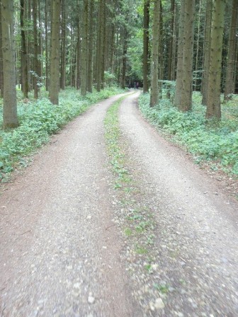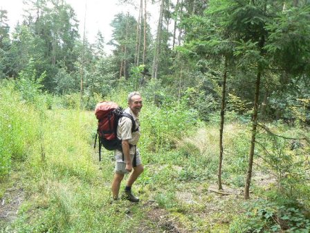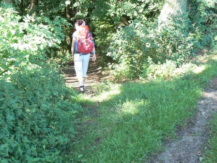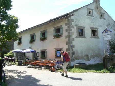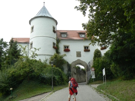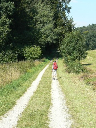 Durch die Holzgasse gehen wir zurück, biegen rechts in den Waldweg, wo wir wieder die Markierung E8 / Oberpfalzweg finden. Durch den Thurn und Taxis’schen Forst, später auf Feldwegen bis zur Straße, die zum Lehmhof führt. Hier rechts hinunter zur Staatsstraße, die wir bei einer kleinen Kapelle erreichen. Hier rechts und etwa 250 m entlang der verkehrsreichen Staatsstraße bis wir nach links in das Sträßchen nach Ettersdorf einbiegen. Im Ort rechts ab nach Wiesent – immer der Markierung folgend. In Wiesent kurze Einkehr im Biergarten des Gasthauses mit Metzgerei Schellerer, Schlossplatz 3, dann am Schloss vorbei, über die Brücke, dann links in die Petersberger Straße, von der wir nach etwa 300 m steil rechts Richtung Hermannsberg abbiegen, immer der Markierung nach durch einen schönen Heidelbeerwald auf die Lerchenhaube und mit herrlichen Ausblicken – am Horizont grüßt schon Straubing und gegenüber das Schloss Wörth - hinunter nach Wörth, wo wir im Gasthaus Butz sehr mittelmäßig bewirtet werden. Dagegen genießen wir die freundliche Bedienung und den guten Kuchen im *Rathaus-Café. Direkt am Café steigen wir den Schlossberg hoch zum Schloss Wörth, das weithin sichtbar über dem Städtchen thront, und besichtigen den Innenhof und die Kirche. Über den Parkplatz gehen wir um das Schloss herum und finden den Pfad hinunter zur Straubinger Straße, bald biegen wir links ab in die Hungersdorfer Straße. Und hier im Ortsteil Hungersdorf müssen wir uns neu orientieren: Der E8 biegt ab nach Norden, wir aber folgen dem lokalen Weg Nr. 1, der parallel zur Staatsstraße nach Tiefenthal führt und am Ortsende wieder über den Berg nach Hofdorf führt. Leider ist unser Quartier im Gasthaus Pflamminger nicht sehr angenehm: Eigentlich ein schönes altes Haus, aber eine unfreundliche Bedienung und sehr mittelmäßige Küche. Das Zimmer ist klein und die Nachtruhe wird durch Tischkicker und Kegelbahn gestört.