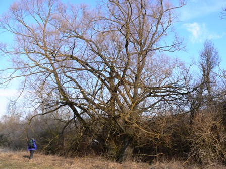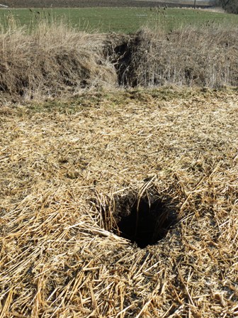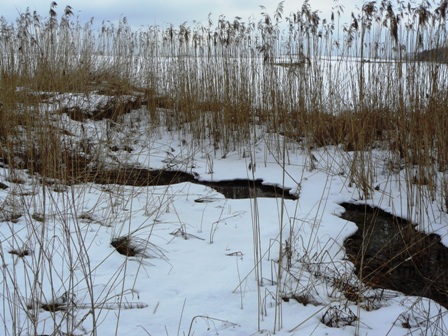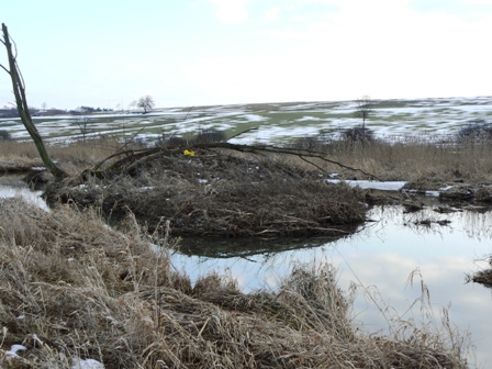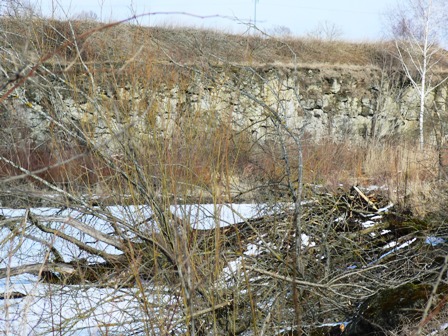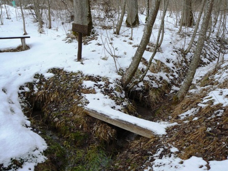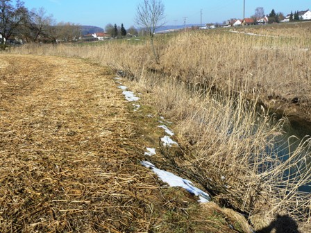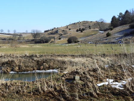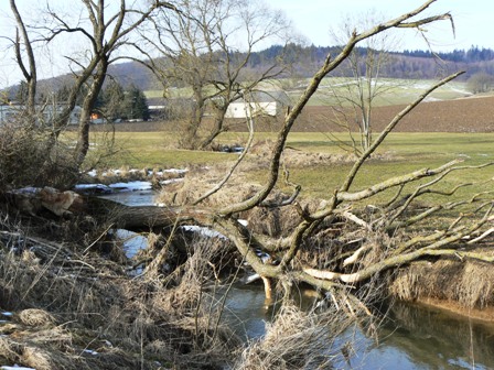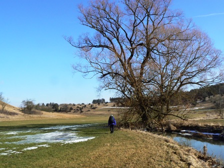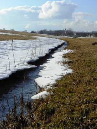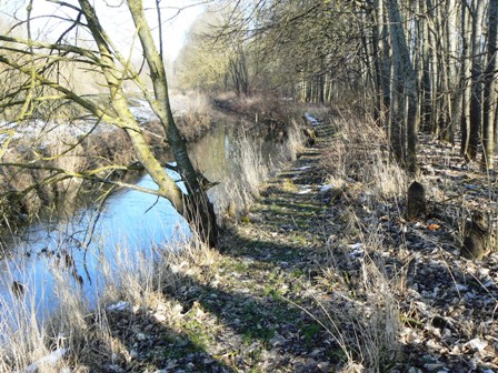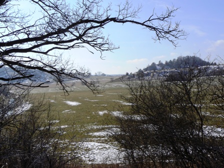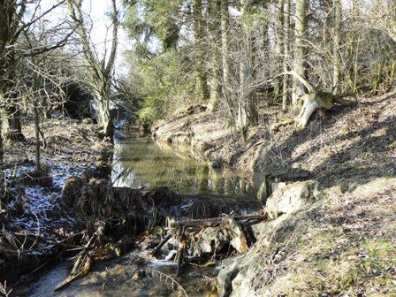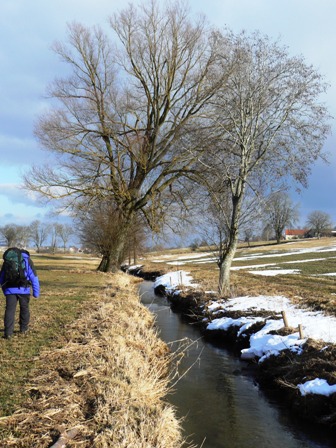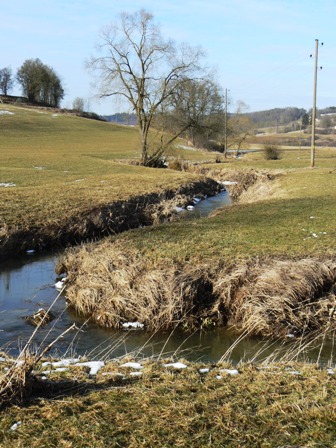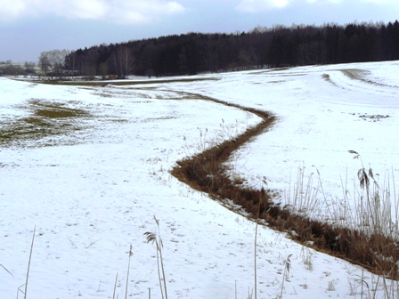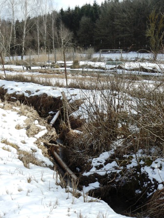 Hier liegt noch Schnee. Die Kessel ist leider begradigt, wird von Drainagen gespeist und versorgt bald einen Fischteich mit Wasser. Freund Biber kann der verschlechterten Wasserqualität in den Teich im Suevit-Steinbruch ausweichen