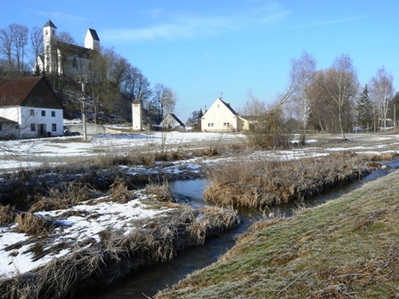 Rückblick auf Diemantstein Uralte Weide an der Kessel Stilecht renovierte Fenster der Hohenberger Mühle