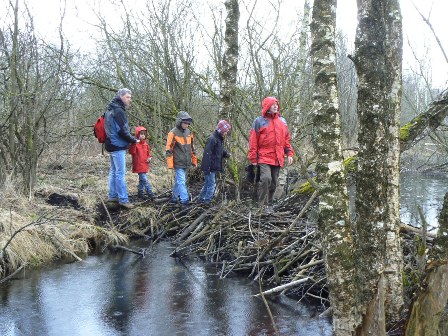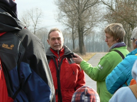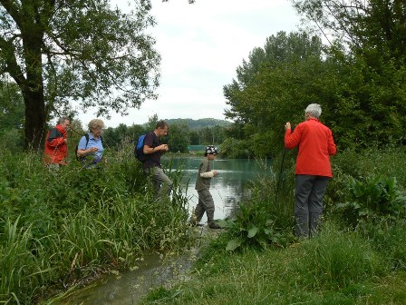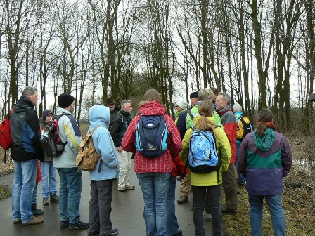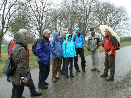 Rundwanderung durch das Biberland im Langenauer Donauried: Von den Gebäuden der Jungviehweide in der Nähe der Sixenmühle zwischen Langenau und Riedheim wanderten wir zum Biberrevier am Schwarzen Graben, wo eine Biberburg direkt an der Karlsbrücke liegt und mit Hilfe einer Informationstafel gut erklärt wird. Mit Drainagerohren und Bypassgräben hat die Stadt Langenau den Überschwemmungsbereich etwas eingegrenzt. Dennoch war ein Durchkommen in der Wasserwildnis nicht möglich. So mussten wir zurück um über die Zwingerbrücke zum Landesgrenzgraben zu gelangen. Hier befindet sich das erste, größte und eindrucksvollste Biberrevier in Baden-Württemberg: Dämme, Kanäle, Burgen, angenagte Bäume, Rutschen, Röhren, überschwemmter Auwald ... Wildnis!! Weiter entlang des Langenau-Ramminger Grenzgrabens gelangten wir zum Karstquelltopf Grimmensee mit dem karstkundlichen Lehrpfad, wieder mit Biberburg und gefällten Bäumen. Vorbei an den Wasserfassungen der Landeswasserversorgung kehrten wir nach 12 km zur Jungviehweide zurück.