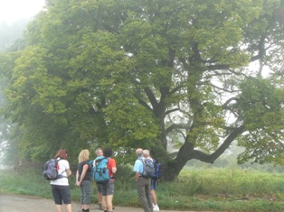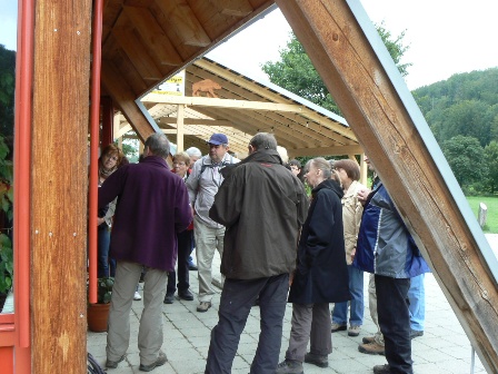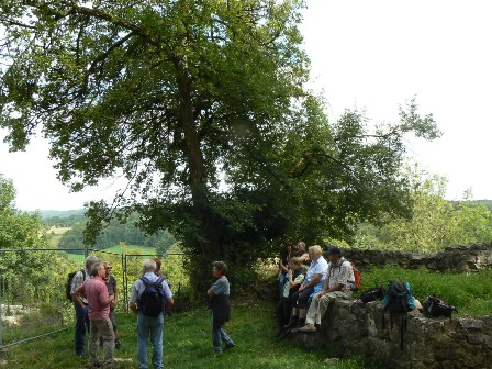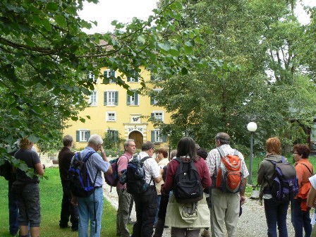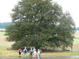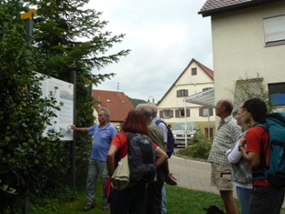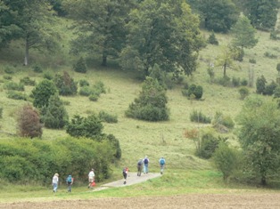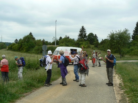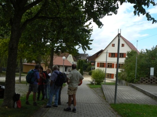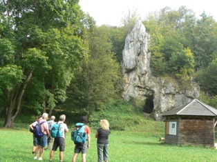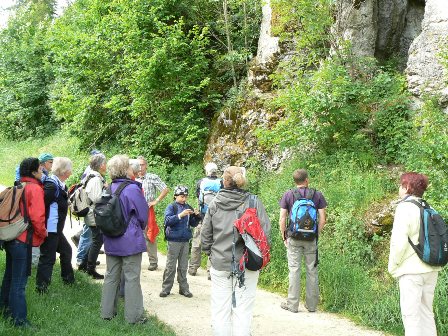 Wieder Traumwetter und eine interessierte, angenehme Wandergruppe: Vom HöhlenHaus an der Charlottenhöhle auf dem Jakobswegle zum Jenischendorf Burgberg mit der Alten Mühle und dem Schloss, Einblicke in den Steinbruch, im Sparenwald das Bettelmanns Grab, die Stettener Wallfahrtskirche und ausgedehnte Rast auf dem Vogelherd. Rückweg über die Kaltenburg zur Charlottenhöhle.
