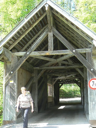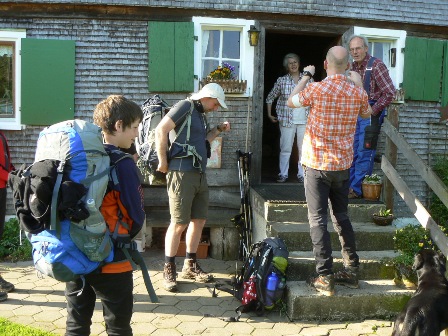 1. Tag: Samstag, 22. Mai 2010: Traumwetter ist angesagt - nach 3 Wochen Regen und Kälte! Die Bahn bringt uns nach Fischen im Allgäu - und die erste Überraschung: Unser Bahn-Wochenendticket gilt auch für den Bus nach Hittisau. Der in Hittisau wohnende Busfahrer überzeugt uns davon, dass der direkte Aufstieg auf den Hochhädrich viel schöner sei als der lange Asphalthatsch ins Tal hinein zum Höfle. Also steigen wir vor Hittisau aus, überqueren die Bolgenach bei Reute auf einer schönen Holzbrücke (783 m), gehen rechts an wasserbetriebenen Sägmühlen vorbei hoch auf die Straße, folgen ihr etwa 1 km, bis uns die Markierung steil links hoch über die Loch-Alpe auf den Hochhädrich (1565 m) führt. Hier beginnt der luftige Steig, ein alpiner Premiumweg, auf und ab, am Falken teilweise versichert, Aussicht zum Bodensee, ins Alpenvorland, in den Bregenzerwald, in die westlichen Allgäuer Alpen. Über Eineguntkopf, Hohenfluhalpkopf und Seelekopf (1663 m) erreichen wir völlig erschöpft die Bergstation der Hochgratbahn: Wir mussten die Überschreitung im Eiltempo absolvieren, denn die letzte Talfahrt der Hochgratbahn ist um 16:30 Uhr! Das Staufner Haus war leider völlig ausgebucht. An richtige Bergwanderer denken die Hochgratbahnbetreiber wohl nicht. Wer die Nagelfluhkette von Osten oder von Westen überschreiten will, muss dies im Dauerlauf tun, kommt völlig erschöpft an und sagt: Nie wieder zum Hochgrat! Wir wünschen allen Nagelfluhwanderern also einen Nächtigungsplatz auf dem Staufner Haus! Oder eine göttliche Eingebung ins Gehirn der Hochgratbahnbetreiber: Letzte Talfahrt (mit Busanschluss nach Oberstaufen) nach 18 Uhr! Aber wir hatten noch Glück bei aller Erschöpfung, denn der **Alphornhof der Familie Wagner in Weißach zwischen Oberstaufen und Steibis erweist sich als wahre Oase, bewohnt von gastfreundlichen (und musikalischen) Menschen.