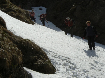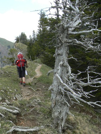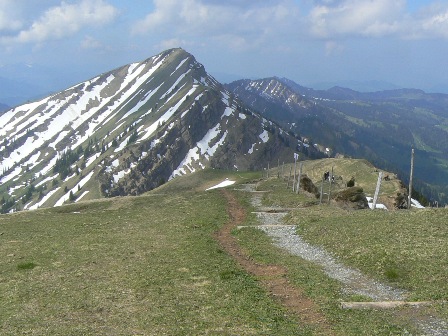 2. Tag: Pfingstsonntag, 23. Mai 2010: Nach einem perfekten Frühstück herzlicher Abschied von der Familie Wagner, zur Bushaltestelle Weißachmühle, mit der Hochgratbahn auf den Berg und weiter auf dem Pfad zwischen Himmel und Erde: Hochgrat (1834 m), Brunnenauscharte (1626 m), Rindalphorn (1821 m), Schneeabfahrt in die Gündlesscharte (1542 m), Gündleskopf (1748 m), Buralpkopf (1772 m), Sedererwände (1600 m), Sederer (1737 m), Stuiben (1749 m) mit versichertem und zum Teil verschneitem Abstieg und zuletzt der Steineberg (1683 m), macht zusammen 1010 Höhenmeter Anstieg und am Ziel in Gunzesried schließlich nach 15 km Höhenwanderung auch 1734 m Abstieg. Aber heute haben wir Zeit, keine Hochgratbahn zwingt uns zur Eile, die Blümchen am Wege, ausgiebige Genussrasten und die Fernsicht kommen zu ihrem Recht. Das Gasthaus zum *Goldenen Kreuz in Gunzesried erwartet uns ohne Zeitbegrenzung! Wirt Bernhard weiß, dass wir kommen.