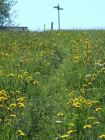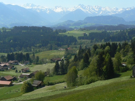 3. Tag: Pfingstmontag, 24. Mai 2010: Noch schöneres Wetter, klarste Sicht - leider der letzte Tag. Auf schönen Wiesenwegen von Gunzesried (889 m) hinauf aufs Hüttenberger Eck (1007 m), Panoramablick ins Oberallgäu, auf eigenen (schwierig zu beschreibenden!) Wegen hinunter zum Sonthofener Illersee, dann umrast von Myriaden von Radlern auf dem Illerdamm (E 5! Kann man das nicht besser machen?) nach Fischen zum Bahnhof.