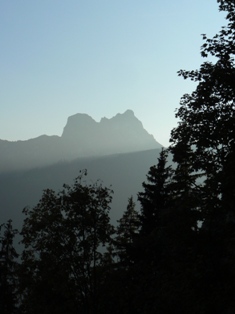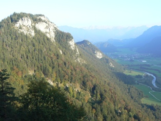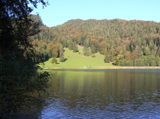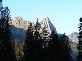 1. Tag: Freitag, 30. September 2011: Es ist wieder mal Traumwetter angesagt. Aus Zeitmangel fahren wir (leider) mit dem Auto nach Pfronten, wo wir in der Nähe des Bahnhofs Steinach bei der Breitenbergbahn parken. Ein schöner Aufstieg im frühherbstlichen Wald bringt uns hinauf zur Mariengrotte unterhalb der Burgruine Falkenstein, von wo ein abwechslungsreicher Wald- und Aussichtspfad hinüber zur Salober-Alpe und dann hinunter nach Vils. führt. Anmerkungen: Der südseitige Aufstieg von Steinach aus ist weitaus schöner als der offizielle Maxweg, die asphaltierte Zufahrtsstraße zum Hotel Falkenstein. Oben kann man die rechtsseitigen Abkürzungspfade gehen und somit wieder Asphalt sparen. Als Etappenziel war das leider ausgebuchte Wirtshaus am Alatsee vorgesehen. Wir mussten deshalb nach Vils absteigen. Ü: *Grüner Baum