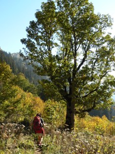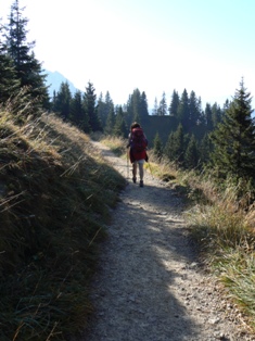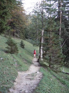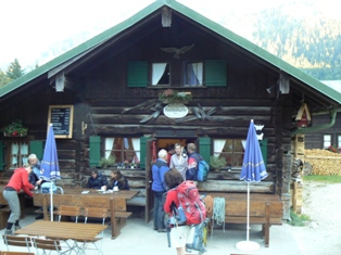 4. Tag: Montag, 3. Oktober 2011: Abschied von der gastlichen Kenzenhütte und den netten Wanderfreunden aus Pähl am Ammersee, Aufstieg zum Bäckenalmsattel, Abstieg ins Tal und ein etwas langweiliger Forstweg hinaus zum Schloss Linderhof, wo wir gerade noch den Bus nach Garmisch-Partenkirchen erreichen (Abfahrt am Feiertag 11:06 Uhr, dann erst wieder um 14 Uhr!). Wer sitzt im Bus? Unsere Freunde aus Pähl! In Garmisch-Partenkirchen reicht die Zeit zum genussreichen Kaffeehausbesuch im Café Kneitinger, ehe wir kostengünstig mit dem Werdenfels-Ticket mit der Bahn (Umsteigen in Reutte) nach Pfronten zurückbummeln. Den Kontrast zu den Traumtagen in den Bergen bildet der Autobahnstress auf der Heimfahrt.
