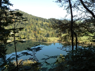 Alatsee am frühen Morgen Alpensalamander Schwansee vom Alpenrosenweg aus gesehen