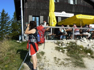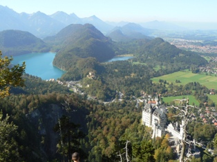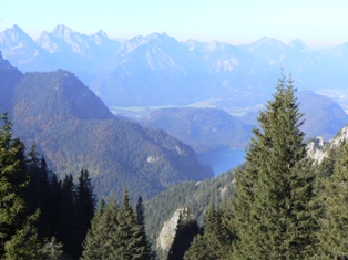 2. Tag: Samstag, 1. Oktober 2011: Durch die Vilser Scharte hinauf zum Alatsee und weiter, immer auf der südlichen Talseite, bis zum Lechfall bei Bad Faulenbach. Von hier zum Alpenrosenweg, der am Alpsee bei Hohenschwangau endet. Hier ist natürlich tourimäßig die Hölle los, und wir müssen außerdem froh sein, nicht von einer Gruppe tollwütiger schwäbischer MTB-Fahrer über den Haufen gefahren zu werden. Über die Marienbrücke mit der Postkartenansicht von Schloss Neuschwanstein überqueren wir die Pöllatschlucht und steigen inmitten vieler Wochenendwanderer aus allen Kontinenten steil, schweißtreibend und aussichtsreich zum Tegelberg hinauf, wo uns auf dem Tegelberghaus der Lohn erwartet. Leider ist die Hütte überfüllt, so dass wir mit der überteuerten Tegelbergbahn ins Tal fahren müssen. Warnung: Schwangau und Hohenschwangau sind ein extrem teures Pflaster, das Preis-Leistungsverhältnis ist nicht gut, und nicht zuletzt gibt es höchst unfreundliche Wirtsleute wie z. B. in der Romantic-Pension Albrecht, vor der hier wegen extremer Unfreundlichkeit bei der telefonischen Quartieranfrage gewarnt wird. Ü: Hotel Müller (sehr freundlich, aber Zimmer sehr klein u. teuer)