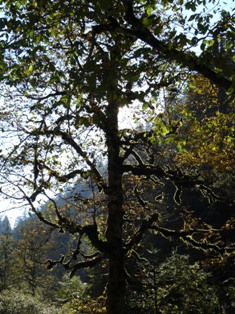 Alter, bemooster Bergahorn im Gegenlicht Brünnlein im Walde