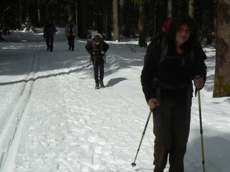 1. Tag: Karfreitag, 2. April 2010: Die Schwarzwaldbahn bringt uns nach Triberg, wo wir in den Bus 7270 nach Schönwald (Haltestelle Ortsmitte) umsteigen. An der Kirche weist uns die Markierung gelbe Raute den Weg zur Elzquelle beim Furtwänglehof. Ab hier folgen wir dem Westweg (rote Raute) / E 1 zur Martinskapelle. Unterhalb finden wir die tief verschneite Bregquelle - und Serben aus Novi Sad / Neusatz, die auch mal sehen wollen, wo ihre Donau herkommt. Über den Günterfelsen, das Naturfreundehaus Brend (guter Kuchen!) und den aussichtsreichen Brend (1149 m) erreichen wir die Hofgruppe Raben, an der wir den Westweg verlassen und links der Markierung blaue Raute nach Furtwangen folgen, zunächst auf der Straße, später auf einem schönen Fußpfad, der über das Gymnasium und den Friedhof direkt hinunter in die Stadtmitte von Furtwangen führt. Ü: *Hotel-Gasthof zum Ochsen