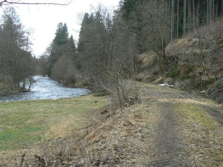 2. Tag: Samstag, 3. April 2010: Wir folgen den Wanderwegweisern zur Martin-Schmitt-Straße (!), der B 500, queren und gehen links auf dem Gehweg neben der Straße, bis der Querweg Schwarzwald - Kaiserstuhl - Rhein (rote Raute auf gelbem Grund) rechts auf die Trasse der ehemaligen Bregtalbahn, heute Radweg, schwenkt. So gelangen wir nach Vöhrenbach, wo es im Stadtcafé Stiller wieder mal guten Kuchen gibt. Leider auf viel Asphalt geht es am Hang entlang zum Gasthaus Waldrast. Hier queren wir die einmündende Straße, verlassen den markierten Weg, der links bergauf führt, und gehen geradeaus auf dem rechten Waldweg ganz sanft durch schönen Hochwald am Hang entlang höher, bis uns ein Wegweiser zum Bernreutehof wieder in Kehren abwärts zur Breg führt. Etwas oberhalb des Bernreutehofes können wir die Breg überqueren und wieder auf der ehemaligen Bahntrasse wandern. Ein markierter Zickzackweg bringt uns kurz vor der Eisenbachmündung hinauf zur Ruine Neufürstenberg und hinunter in den Ort Hammereisenbach-Bregenbach. Ü: * Gasthaus zum Hammer