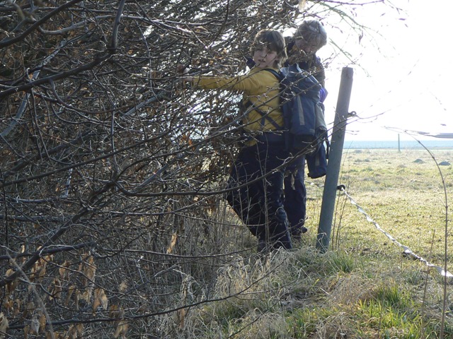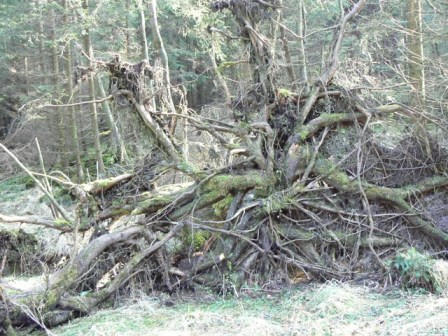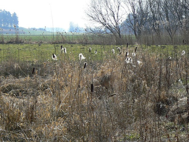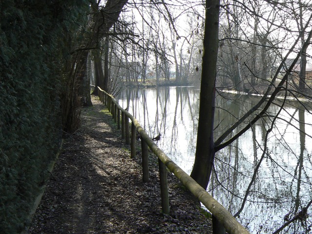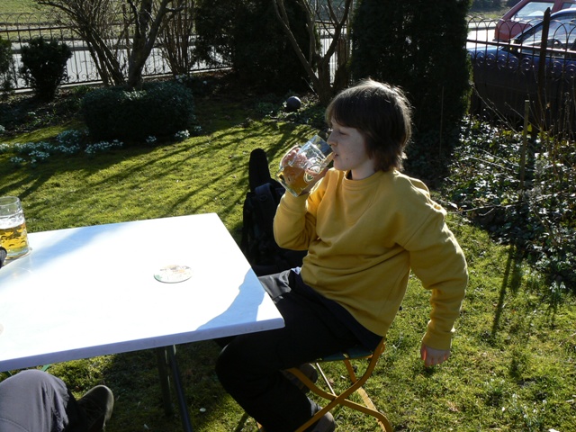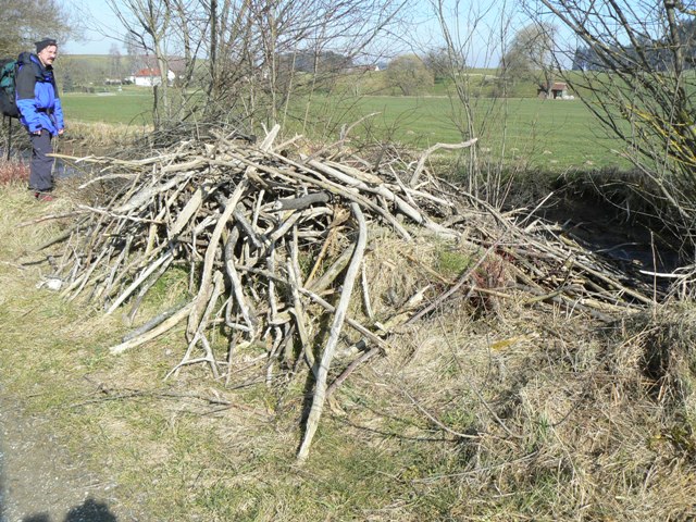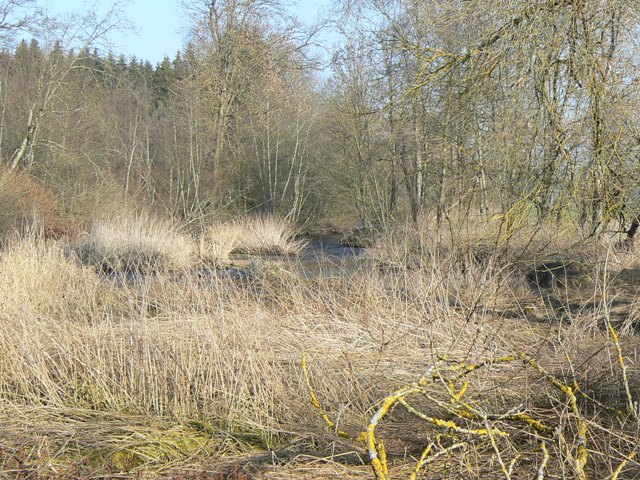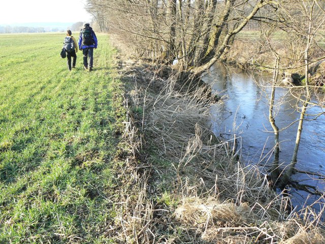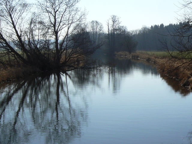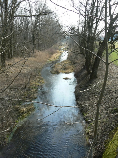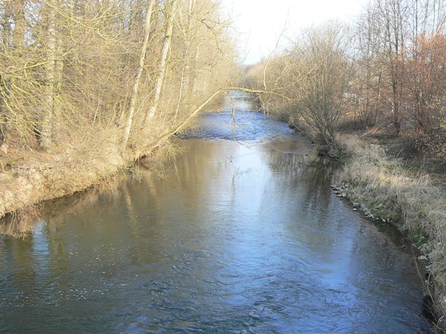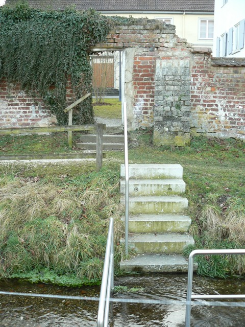3. Tag: Aschermittwoch, 21. Februar 2007: Wieder Kaiserwetter! Und dazu ein besonders gutes Frühstück. Gleich darauf der Knaller: Direkt nach Gutenzell beginnt der naturnächste Abschnitt der ganzen Rot: Auen-Urwald mit Schneeglöckchen, Biberspuren und -burgen, bizarre Baumgestalten, Uferabbrüche, Wasseramseln ... Dann Stau und ein Jugendstil-E-Werk (bei Huggenlaubach). Die nächste Mühle hat das erste und einzige "Umgehungsgerinne" an der ganzen Rot. Bald sind wir in Schwendi, wo der etwas vergammelte Besitz der Freiherrn von Süsskind-Schwendi auffällt. Wir essen unseren Aschermittwochsfisch im Gasthof Stern beim Bruder unseres letzten Gastgebers. Schwendi geht mit der Rot nicht sehr gut um: Am Ortseingang ist sie in ein Betonkorsett gezwängt, am Ortsausgang wird sie mit Pferdemist gedüngt, und außerhalb gehen häufig Äcker bis ans Ufer. Sobald dieses aber etwas naturnäher gestaltet ist, finden wir Biberspuren. Vor Rot eine Freizeitanlage, deren Abfluss wir im Stabweitsprung überwinden. Einige Jungs führen uns durch ihre Baumhausvilla an der Rot. In Burgrieden verschwindet unser Rotkanal unter einem Fabrikgelände. Wir fahren mit dem RAB-Bus ins benachbarte Laupheim bis zur Bushaltestelle Judenberg, wo wir in der historischen, ehemals jüdischen **Schildwirtschaft zum Rothen Ochsen gut untergebracht werden und noch besser speisen. [18 km]