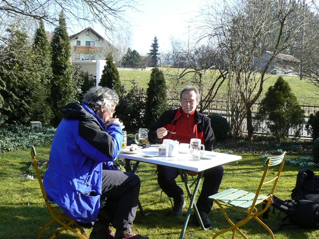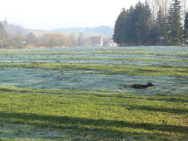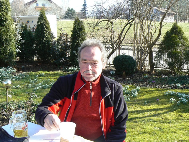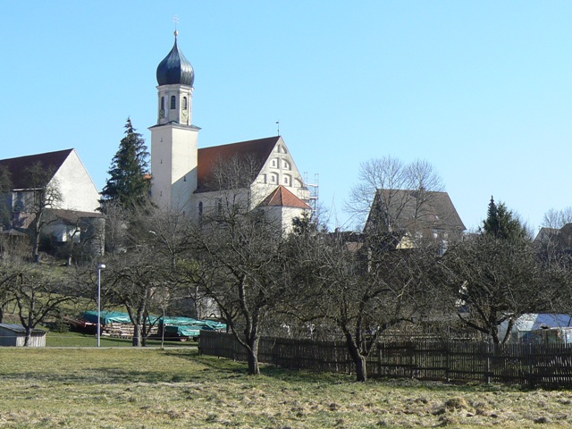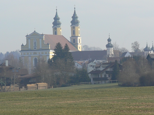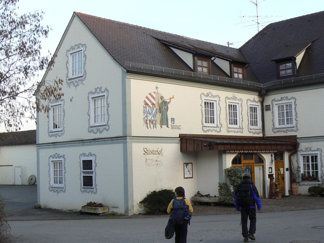 2. Tag: Fasnetsdienstag, 20. Februar 2007: Wieder kündigt sich ein strahlender Frühlingstag an. Unsere freundliche Taxifahrerin führt uns durchs Kloster und fährt uns anschließend wieder hinaus zum Parkplatz am Stausee. Reif und Sonne schaffen Kunstwerke auf den Wiesen. Wir aber wandern flussabwärts nach Spindelwag zum Zusammenfluss der beiden Quelläste Pfaffenrieder Bach und Ellbach. Hier sehen wir erste Biberspuren. Leider haben wir ab hier für viele Kilometer harten Asphalt unter den Schuhe. Es folgen viele kleine Wasserkraftwerke und große Sägereien. Leider gibt es außer in Rot an der Rot kein einziges Gasthaus im Tal. Aber an der Grabenmühle, einem schönen Jugendstilhaus, können wir in der Sonne rasten und werden vom Müller aufgeklärt: Früher gab es keine armen Müller und keine reichen Bäcker, heute gibt es keine reichen Müller und keine armen Bäcker. Tatsache ist, dass es kaum mehr Müller und nur noch wenige richtige Bäcker gibt! Bald darauf erfreuen wir uns wieder an Biberspuren. An der ehemaligen Mühle Binnrot:" Des isch Privatgrund!!!" Aber der freundlich, zurückhaltende Bauer rückt das Negativbild, das uns die am Gartentischchen sitzende Blondine zunächst vermittelt hat, wieder zurecht. Erst in Bechtenrot finden wir in der gelben "Post" eine Oase. Drinnen feiert der katholische Frauenbund mit Hochwürden=Pirat Fasnacht, draußen sitzen wir zwischen Krokussen und Schneeglöckchen in der Sonne und genießen das Leben bei Härle-Bier, Kaffee und gutem Kuchen. Dieses Wirtshaus ist täglich geöffnet und wird unter der Woche von der 82-jährigen Mutter des Wirtes betrieben. Leicht geht es an der Rot entlang weiter, deren Ufer immer mehr von der Landwirtschaft misshandelt wird: Äcker bis ans Wasser, Flüssigmistbäche münden in die Rot, mit Mist aufgefüllte Uferabbrüche ... Links das durch einen Brand beschädigte Schloss Edelbeuren, aber kein Kirchturm von Gutenzell in Sicht. Kein Wunder, unser Tagesziel ist ein ehemaliges Zisterzienser-Kloster, wo es keinen Kirchturm, sondern nur einen Dachreiter gibt. Wir betreten die weitläufige Anlage der Reichsabtei Gutenzell durch einen kleinen Durchlass in der Mauer, besichtigen die barocke Pracht, an der Meister Dominikus Zimmermann, Vater der Gutenzeller Äbtissin Maria Alexandra, beteiligt war. Klein-Peter wundert sich etwas über die 5 Schädel und Skelette von Heiligen, die hier als Reliqiuen verehrt werden. Im **Klosterhof Gutenzell finden wir ein sehr gutes Quartier. Leider hat das Restaurant Ruhetag, aber unsere Wirtin, Frau Sax, gibt uns die Schlüssel ihres Privatautos, so dass wir zum Essen ins benachbarte Ochsenhausen fahren können. Wanderer seien vertrauenswürdig, sagt sie. Ich freue mich über das beste Einzelzimmer, in dem ich je geschlafen habe. Die Rekreation im Colani-Bad aus den 70ern ist äußerst erholsam. [19 km]