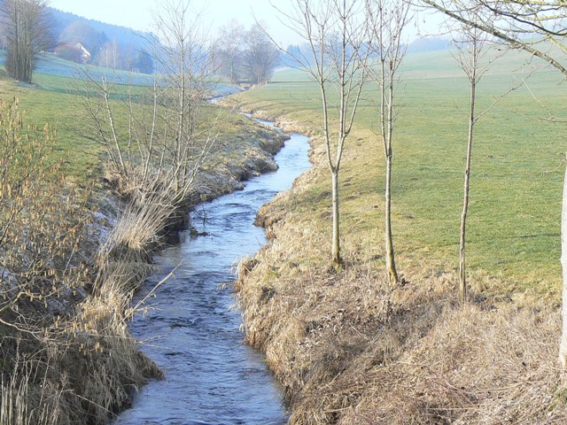 Rote Quelle am Ufer Mäander zwischen Wald und Wiese Der erste Pegel