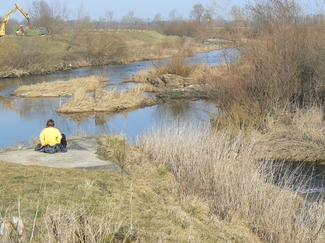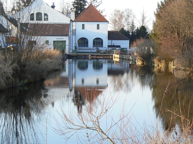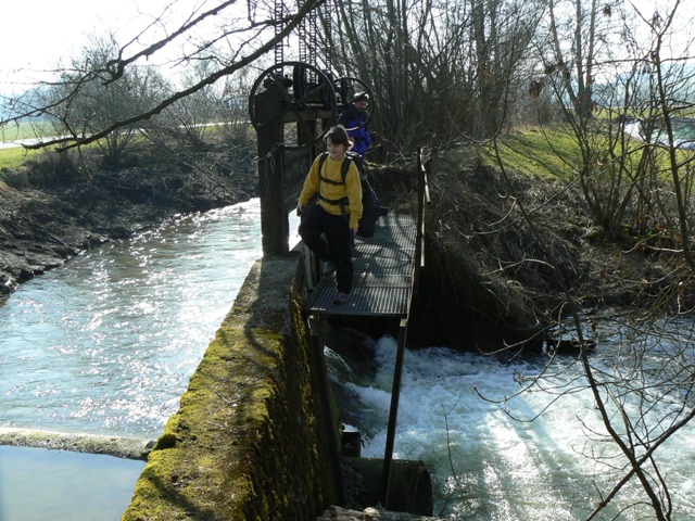 4. Tag: Donnerstag, 22. Februar 2007: Da sind tatsächlich Wölkchen am Himmel! Aber die verziehen sich rasch, und wir haben wieder das gewohnte Blau. Der Bus bringt uns hinüber nach Burgrieden an die Rot, wo uns nur Pferdeweiden am Fortkommen hindern. Straßenlärm begrüßt uns bei Achstetten. Hier quert die autobahnähnliche B 30 die Rot. Wir erhalten Einblick in das Innere eines Pegelhäuschens. wo gerade der Datenlogger repariert wird. Die große Stettener Mühle im Taubried mahlt schon seit über 20 Jahren nicht mehr. In der Flur "Zwischen den Wassern", wo die Flüsse Westernach und Rot sich sehr nahe kommen, wurde um 1930 ein Kanal von der Westernach zur Rot gegraben, in dem fast das ganze Wasser der Westernach die Rot speist. Diese wiederum führt dadurch dem Donaustausee des E-Werks Donaustetten eine größere Menge Wasser zu. Vorher aber noch durchqueren wir am südwestlichen Ortsrand von Dellmensingen ein Naturparadies, in dem sich auch Freund Biber wohl fühlt. Dann aber geht's in die **Brauereigaststätte zum Adler zum wohlverdienten Mittagessen. Auf schönen Uferwege, auf denen einige gut informierte Spaziergänger unterwegs sind, erreichen wir zunächst das Wehr, an dem fast die ganze Rot inklusive Westernach in den Donau-Stausee eingeleitet wird. Die Rest-Rot wird unter dem Stausee durchgeleitet und mündet in die Rest-Donau. Nach der Mündungsfeier gehen wir noch zur Mündung der kümmerlichen Rest-Westernach, die ebenfalls unter dem Stausee durchgeleitet wird. Schnell sind wir am Bahnhof Erbach, von dem die Züge im Stundentakt fahren. [13 km] Gesamtstrecke 64,5 km
