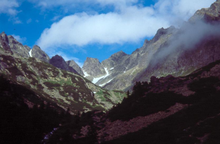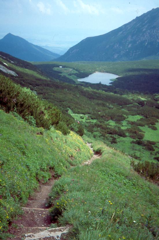 Durchs Monkova dolina im Totalreservat der Belaer Tatra steigen wir teilweise im Regen steil hoch zum Široké sedlo. Oben gibt es eine trockene, aber kalte und blumenreiche Rast, bei der uns eine neugierige Tatragämse erschreckt. Über den Kopské sedlo und den Weißen See erreichen wir unser Quartier in der Hütte am Grünsee, direkt unter dem imposanten Karfunkelturm.