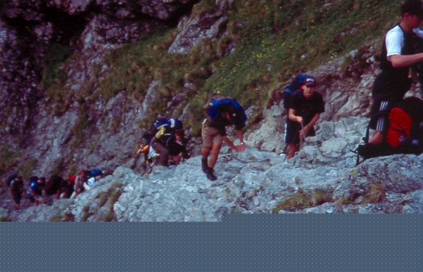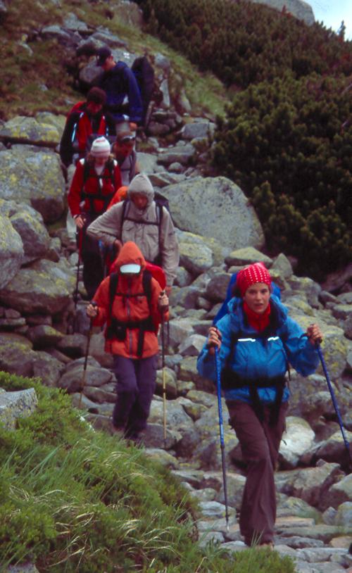 Lässt Petrus eine Rysy-Besteigung zu? Wir versuchen es einfach! Der Rysy versteckt sich im Nebel. Wir finden in trotzdem. Über Felsschutt, versicherte Felswände und Schneefelder erreichen wir die urige Rysy-Hütte, wo wir in 2250 m Höhe rasten. So gestärkt ist der höchste Gipfel Polens, der 2500 m hohe Rysy, für uns kein Problem. Leider reicht die Aussicht nur wenige Meter. Aber es ist ein gutes Gefühl, auf dem Gipfel-Grenzstein mit einer Pobacke in Polen und mit der anderen in der Slowakei zu sitzen. Beim Abstieg macht das Abfahren über steile Schneefelder großen Spaß. Schnell sind wir wieder am Popradske pleso, packen unsere Siebensachen zusammen, gehen hinunter nach Strbske Pleso, von wo uns die Tatrabahn hinunter nach Poprad bringt. Im "Egidius" stärken wir uns für die lange Heimfahrt, die pünktlich um 20.10 Uhr beginnt und am
