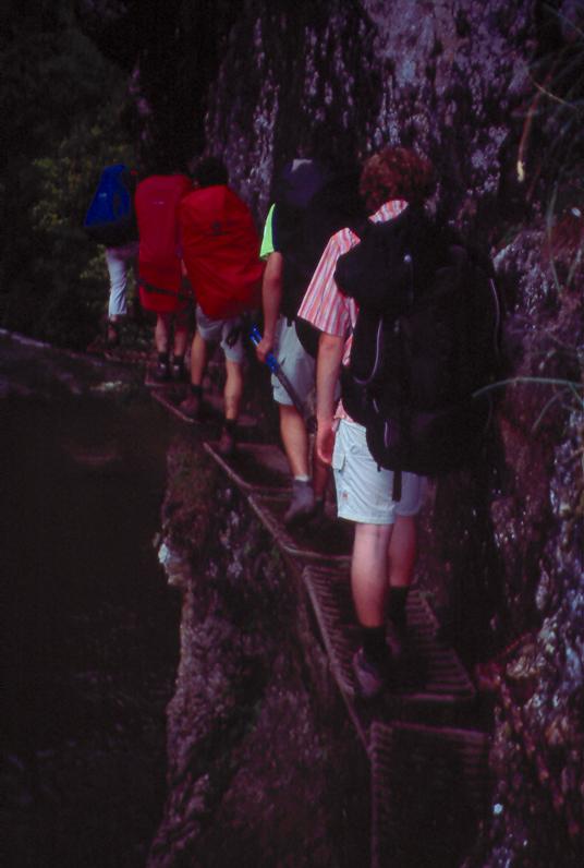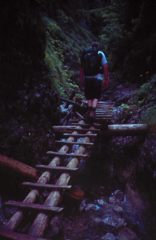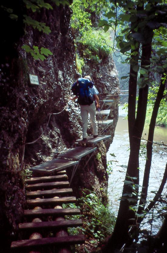 Auf demselben Feldweg wandern wir heute wieder zum Hornád. Vom nächtlichen Regen ist der Weg glitschig, so dass es an manchen Stellen nicht ganz ungefährlich ist, auf ausgesetzten Trittrosten und Holzleitern hoch über dem Fluss zu balancieren. Der Weg durch die Hornad-Schlucht ist aber dennoch ein absoluter Höhepunkt unserer Tour! Von Čingov aus bringt uns um 15 Uhr der Bus nach Spišská Nová Ves, dann die Bahn nach Poprad und schließlich wieder der Bus nach Ždiar, das uns mit einem Wolkenbruch empfängt. Wir nehmen Quartier im Hotel Sorea Magura, das der slowakische Staat leider nach der Saison schließen will, da größere Instandsetzungen anstehen.
