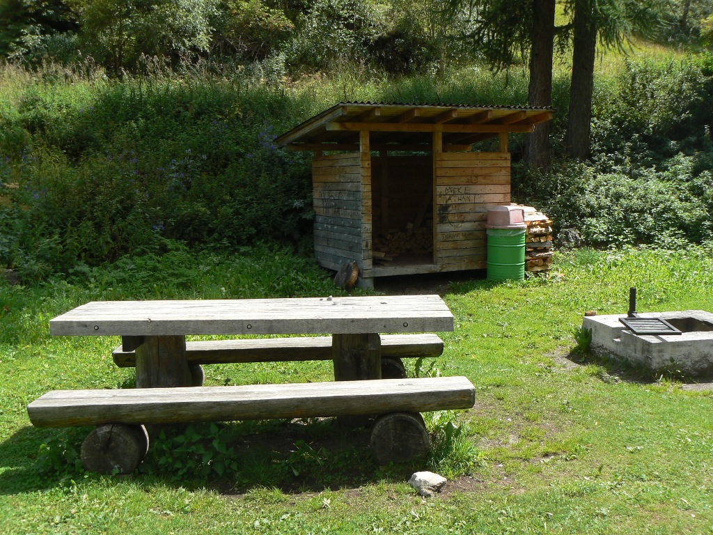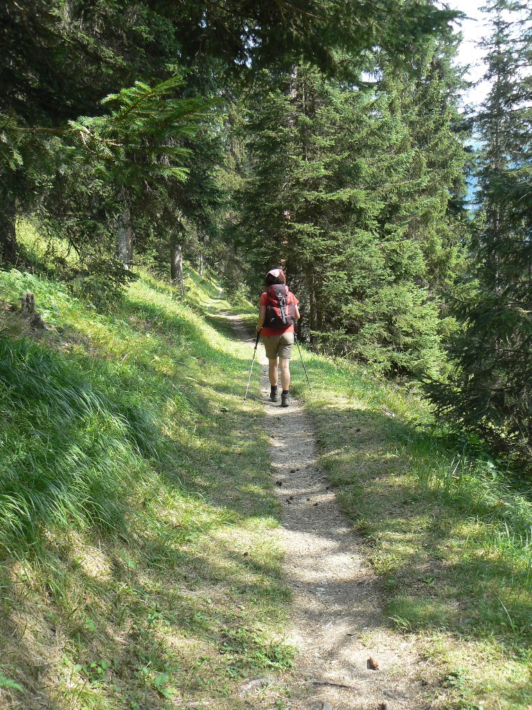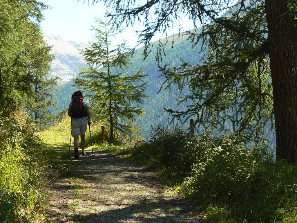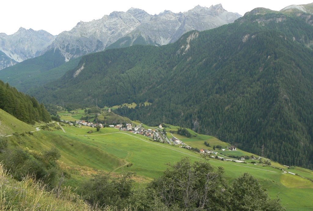 Der Weg mit dem Postauto nach Tschlin ist lang und kurvenreich. Dieses kleine Dorf ist schon faszinierend! Und unsere heutige Etappe ebenfalls. Der letzte Mensch, den wir für viele Stunden treffen, ist die Pfarrersfrau, die wir beim Ausfegen der sehenswerten alten Kirche am Ortsausgang überraschen. Danach einsame Fahrwege, dann Wiesen- und Waldwege, schließlich schmale, manchmal kaum zu erkennende Pfade hoch über dem Inntal, das hier sehr eng wird. In Etappenmitte wieder ein Luxus-Rastplatz mit Brunnen, Bänken, Grillstelle und gefülltem kleinen Holzschuppen. Ringsherum wachsen Goldröhrlinge. Immer wieder geht es kettengesichert in tief eingeschnittene Tälchen, über schmale Holzstege, dann wieder durch Lärchenwälder und über Lawinengänge. Einziges Manko ist der allmählich immer lauter werdende Lärm der Reschenpass-Straße am Gegenhang. Dann geht es auch schon viele Höhenmeter abwärts, zunächst auf Pfaden, dann auf Forstwegen und schließlich wenige Hundert Meter auf der Fahrstraße ins Samnaun. Die „Zivilisation“ in Form von lärmenden Motorrädern und Sportwagen hat uns wieder. Leider ist das Gasthaus Vinadi/Weinberg inzwischen geschlossen, und das große Mehrfamilienhaus an der Straße steht zum Verkauf. Welch ein Kontrast zu den florierenden Dörflein, die wir unterwegs erleben durften!