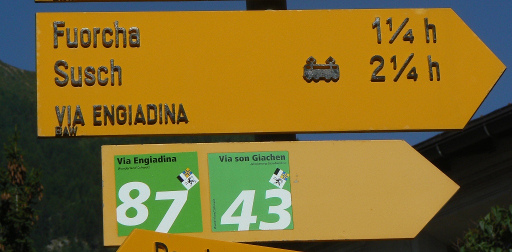 Am Ortsende, kurz nach dem Hotel Baer-Post, zeigt uns der Wegweiser wo’s langgeht: Nach rechts, zunächst auf Asphalt, dann auf Schotter hinauf zur Maiensäss Clüs, heute als Ferienhäuser genutzt. Am höchsten Punkt zeigt der Wegweiser den Weiterweg etwas ungenau an. Richtig ist, der rot-weißen Markierung auf den schmalem Pfad nach links abwärts zu folgen und jetzt Pilze zu sammeln, was in Graubünden nur in der zweiten Monatshälfte erlaubt ist. Es gibt Steinpilze und Goldröhrlinge in rauen Mengen. Unten im Tal gehen wir nicht der Wegweisung folgend auf den Radweg sondern queren zum Innufer, wo ein Wiesen-Traumpfad, gesäumt von wohlschmeckenden wilden Johnnisbeeren (Ribes alpinum), am Fluss entlang nach Susch führt. Oberhalb des Ortes ein mustergültiger Rastplatz. Hinunter zum alten Ortsteil mit dem Planta-Wohnturm und anderen sehenswerten Gebäuden. Auf Asphalt geht es hinauf zur Prasüra, später auf Schotterwegen hinunter zum Inn, den wir auf einer alten Holzbrücke überqueren. Leider sind es noch einige Höhenmeter durch den Ort hinauf zum Bahnhof Lavin neben der Kirche.