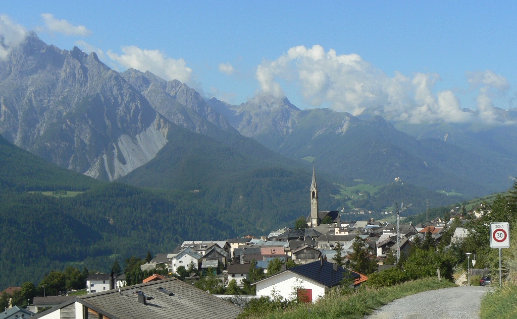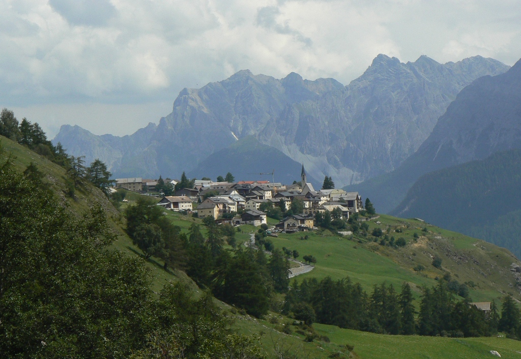 Vom Dorfplatz von Sent aus starten wir Richtung Val Sinestra, begleitet von einem netten Ehepaar aus Chur. Den Fahrweg ins Tal können wir ziemlich am Anfang auf einem parallel verlaufenden Vita-Parcours = Trimm-dich-Pfad vermeiden. Es sind nur wenige Fahrzeuge unterwegs, und auch der Fahrweg bietet mit waghalsigen Brücken, tiefen Schluchten und Erdpyramiden einige Erlebnisse. Das imposante, seit etwa 1970 nicht mehr genutzte Kurhaus Val Sinestra wurde vor bald 20 Jahren von Holländern wieder zum Leben erweckt und heute als einfaches Hotel für Veganer genutzt. Von außen betrachtet macht es auf uns aber einen etwas tristen Eindruck. Die „Heilquellen“ dürfen wegen ihres 300-fach überhöhten Arsengehalts nicht mehr genutzt werden. Über einen schönen, teilweise ausgesetzten, mit Ketten gesicherte Pfad durch den Wald, dann durch Wiesen erreichen wir das kleine Dörflein Vna, einst fast ausgestorben, heute wiederbelebt dank sanftem Tourismus. Der Weiterweg entpuppt sich als Traum-Etappe: Einsamkeit, Stille, Ausblicke, zwei Luxus-Rastplätze, Blumen und Pilze ohne Ende, waghalsige Schluchtquerungen auf schmalen Pfaden und Brücklein. Am dann Ende das Dörflein Tschlin, Musterbeispiel dafür, wie man „am Ende der Welt“ gut leben kann. Ein malerisches Dorf mit intakter Infrastruktur dank der Aktion www.buntschlin.ch, bei der regionale Produkte und Dienstleistungen beworben und vermarktet werden. Immerhin gibt es bei etwa 400 Einwohner zwei Brauereien, die Gerste aus dem Engadin, Hopfen aus der Schweiz und Bergquellwasser aus Tschlin verwenden. Rund 75% der Einwohner sprechen hier im täglichen Leben noch rätoromanisch.