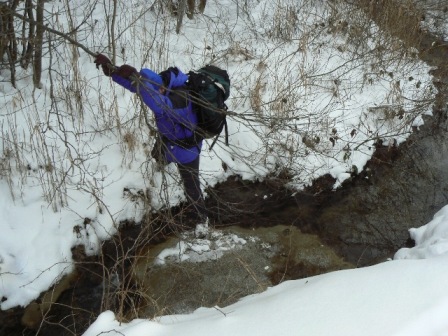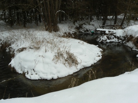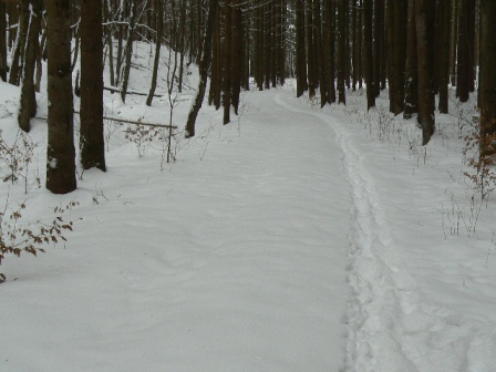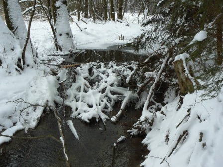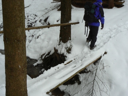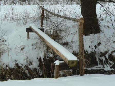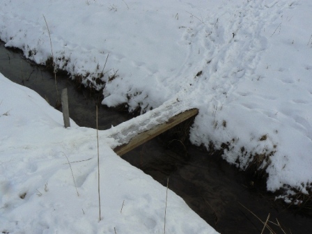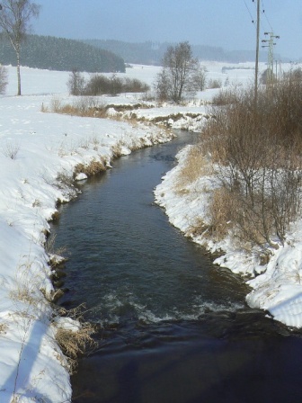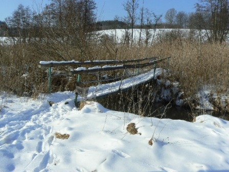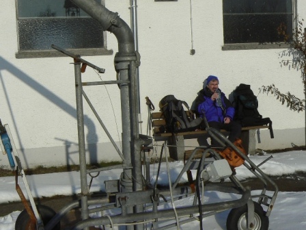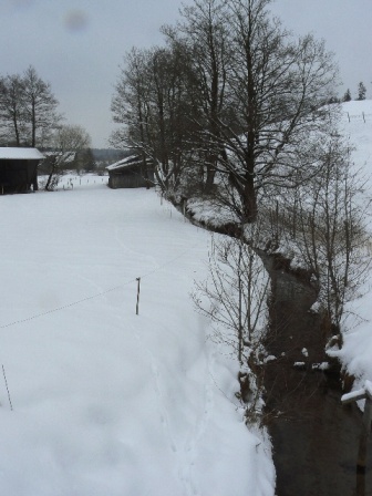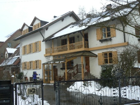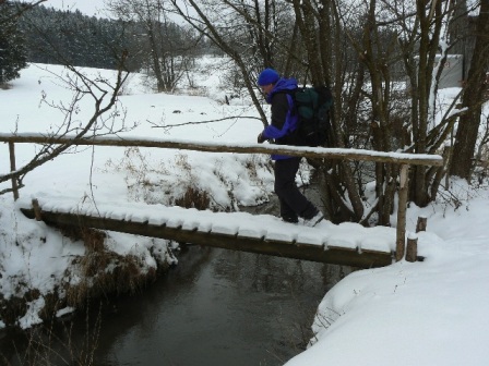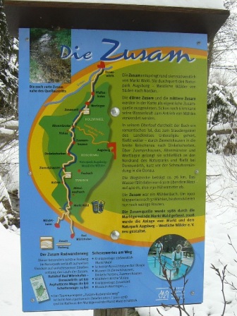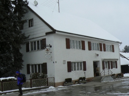 1. Tag: Rosenmontag, 15. Februar 2010 (Markt Wald - Aichen, 14 km): Im Tiefschnee stapfen wir zur Quelle beim unübersehbaren Funkturm, kurz danach ein Rastplatz mit Infotafel - nicht für Wanderer, für Radfahrer! Naturnaher Bachlauf, Wald, Wiesen und schon bald der Campingplatz des Herrn Settele. Wo rasten? In Immelstetten ist die Haustür des Gasthauses Adler offen, wir treten ein, niemand da? Wir rufen. Endlich kommt jemand, die 87 Jahre alte Wirtin, mit Krücke, sehr gebrechlich, die ganz allein hier lebt und das an sich geschlossene Haus verwaltet. Sie bewirtet uns mit gutem Storchenbier zu unserem Rucksackvesper und erzählt die Geschichte des Hauses, von den familiären Schicksalsschlägen, vom Wegzug des älteren Sohnes, vom Verkehrstod des jüngeren Sohnes und von ihrem vor 6 Jahren gestorbenen Mann, vom Wirtshausleben früher und vom langsamen Aussterben des Dorfes: Leerstehende und allmählich verfallende Häuser sowie menschenleere Straßen beweisen die Richtigkeit ihrer Aussagen. Auch die Zusam zahlt ihren Tribut: Kompostsickerwasser läuft hinein, Fischteiche werden mit ihrem Wasser gefüllt, das anschließend in minderer Qualität zurückfließt. Wir werden nachdenklich. Kaffeezeit! In Könghausen ein Wirtshaus mit eternitverkleideter Barockfassade - Kaffee und Bier gibt es, sonst nichts, aber es stinkt bestialisch nach Rauch - bayerische Raucherherrlichkeit. Wenig unterhalb die elterliche Sägemühle des Wirts, betrieben von dessen Bruder, d. h. sie wurde betrieben, denn als das Sägegatter eine Reparatur nötig hatte, wurde der Betrieb eingestellt. Danach der Wirtshauskontrast: In Aichen holt uns die Tochter des Wirtes Zott vom *Gasthof zum Adler zum Adler in Mittelneufnach ab, denn im oberen Zusamtal gibt es keine einzige Übernachtungsmöglichkeit! Bei der Familie Zott sind wir wie schon vor 2 Jahren bestens aufgehoben. Der Seniorchef, der den Betrieb am 1.1.10 an seinen Sohn übergeben hat, kocht exklusiv für uns und erzählt uns viel über das Wirtshausleben in den Stauden.