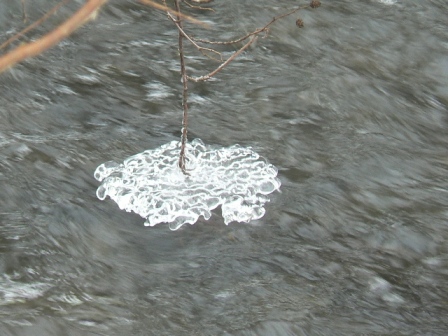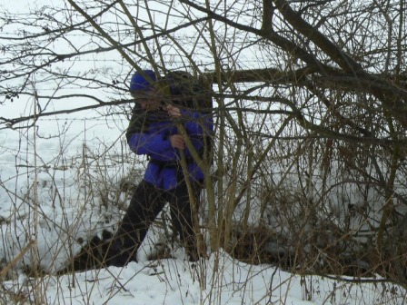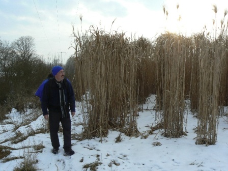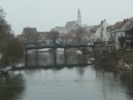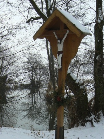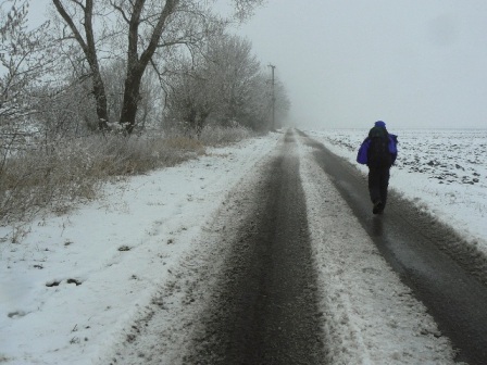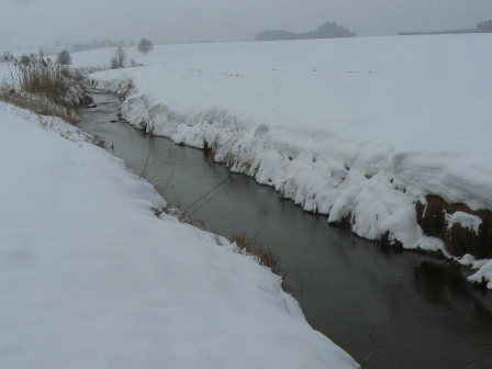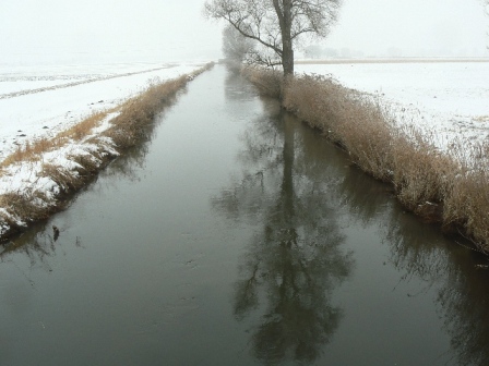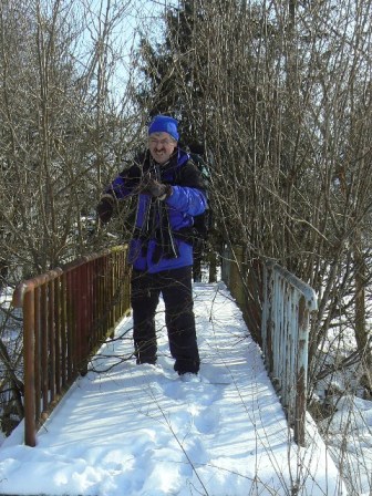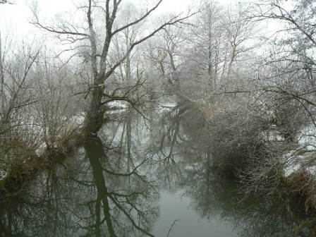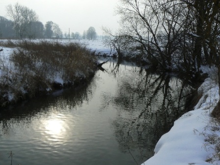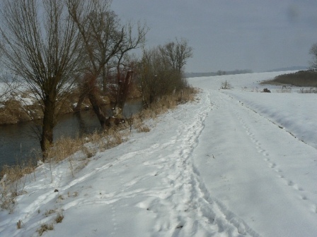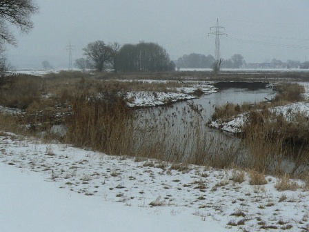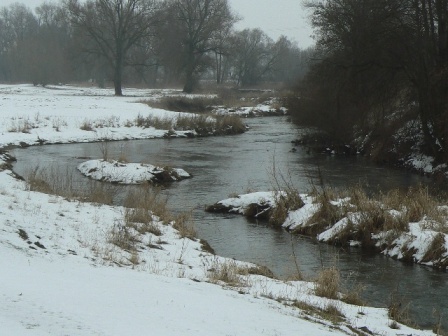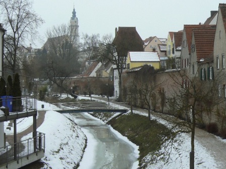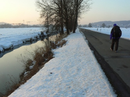 5. Tag: Freitag, 19. Februar 2010 (Unterthürheim - Donauwörth, 20,1 km): Neblig ist's, Rauhreif überzuckert Baum und Strauch, aber bald wird es wärmer, von den Bäumen tropft es und der Schnee wird weich. Auf den Parallelwegen entlang der Zusam kommen wir flott voran. Bei Buttenwiesen verlässt die Zusam ihr eigenes Tal und fließt in der weiten Donauniederung noch einige Kilometer parallel zur Donau, am Schluss im Bett eines ehemaligen Donau-Altarms. Jäger und Fischer haben die Ufer in Besitz genommen, die natürliche Vielfalt ist dahin, auf lange Strecken ist der Uferweg asphaltiert. Auf den letzten Kilometern gehen wir auf den Hochwasserdämmen, was uns in der ebenen Landschaft einen guten Überblick verschafft. Auf den letzten 500 Metern stürzt eine renaturierte Zusam der Donau entgegen.