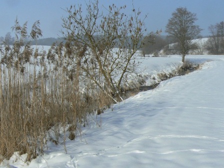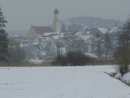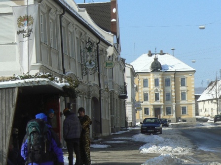 2. Tag: Faschingsdienstag, 16. Februar 2010 (Aichen - Dinkelscherben, 22,5 km): Wirt Zott senior fährt uns persönlich nach Aichen zurück ins Zusamtal. Es ist neblig, aber die Sonne kämpft sich durch. Der Schnee wird weniger, Zaunkönige, Grau- und Silberreiher wundern sich über uns Wanderer im Schnee, Biber zeigen, dass die Zusam ihr angestammter Lebensraum ist. Die Landschaft ist eine liebliche Kulissenlandschaft, die Zusam schlingt Mäander an Mäander. Vor Ziemetshausen schöne Naturzonen, im Ort dann gastronomische Wüste. Das einzige anständige Wirtshaus im Ort, der Adler, hat heute geschlossen, weil gestern Rosenmontagsball war und morgen Fischessen sein wird. Repräsentative Barockgebäude, in denen früher Gasthäuser waren, sind zu minderwertigen Sauf- und Rauchclubs verkommen. Die Bäckerei schließt gerade, wir bekommen in einer Pseudo-Pizzeria, in der es nur am Abend Fertigfraß gibt, gerade ein Bier und vespern unseren Notproviant aus dem Rucksack, da es wirklich nirgends etwas zu essen gibt. Bayerisch-schwäbische Küche - Fehlanzeige! Die Jugend flieht in die Stadt. Auch der Nachmittagskaffe fällt aus, denn das Gasthaus Reischenau ist nicht im gottverlassenen Ort Reischenau sondern im einige Kilometer entfernten Ustersbach. Also Pause auf einer Bank in der Sonne zwischen Kuhstall und Güllegrube. Dennoch ist die Wanderung durch die ehemalige Moorlandschaft entlang der Zusam eindrucksvoll schön - und die Überquerung der Gräben jedes Mal ein interessantes Abenteuer. Nur der letzte Abschnitt auf einer vereisten Straße entlang der Zusam hinein nach Dinkelscherben ist ein Hatsch und die Wartezeit vor der Pension Zusamblick zwischen Autowaschanlage und Gutachterbüro etwas lang. Zum Abendessen bei der Familie Vikari im *Gasthof Adler (08292 1329), neben der Kirche gelegen, müssen wir 15 Minuten in den Ort gehen, werden dafür aber bestens bewirtet.