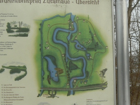 3. Tag: Aschermittwoch, 17. Februar 2010 (Dinkelscherben - Altenmünster, 22,5 km): Thomas' Klappbett und unser Schnarch-Duett haben die Nacht versüßt, aber das Frühstück war in Ordnung. Die Alt-Müllerin der Elmischwangmühle erzählt von den früher reichen Müllern und armen Bäckern. Heute gibt es kaum mehr Bäcker und demzufolge auch bald keine Müller mehr. Die Leute kaufen ihr Brot in der Pseudo-Backstube im Supermarkt oder Discounter. Das Mehl kommt nicht mehr aus der Mühle sondern die fertige Mischung aus der Backmittelfabrik und das Mehl aus den großen Hafenmühlen in Duisburg oder Mannheim. Wie lange die Elmischwangmühle wohl noch mahlen mag? Bei Fleinhausen ein schönes Biberrevier - und der Sägetrupp des Wasserwirtschaftsamtes Donauwörth. Sägen die doch idiotischerweise mitten im Winter dem Biber die Nahrung weg und klauen sie auch noch, indem sie das Holz sofort abfahren. Und dann wundern sie sich, dass das arme Tier weitere Bäume fällt. "Abschießen sollte man sie!" Was hat der Biber wohl dem armen Mann mit der Motorsäge angetan? Warum dieser Biberhass? Viele Flusskilometer lang sehen wir die Folgen dieses Kettensägenmassakers. Rein zufällig wurde dabei auch eine Biberburg niedergemacht. Danach wieder aussterbende alte Dorfkerne und viele Witwen, wie uns der ältere Mann mit dem Holzbein erzählt. Sein Bein hat er bei einem Betriebsunfall bei der Arbeit als Staplerfahrer bei der Brauerei Rapp in Kutzenhausen verloren. Das ist die Brauerei, deren blaue Lastwagen jeden Morgen die Autobahn verstopfen und deren Bier öfters unbestellt vor der Tür steht. Viel zu billig ist der Diesel!!! Bei Gabelbach dann eine Renaturierungsmaßnahme und ein Naturlehrpfad. Eigentlich hat die Zusam bisher diese Späßchen nicht nötig: Meist mäandriert sie frei, es gibt Altwässer, moorige Senken, Schilfgürtel, einfach alles, was ein richtiger Fluss haben muss. Wir finden auf den Spuren der Füchse immer den richtigen Weg hindurch. In Zusmarshausen dann ein echter gastronomischer Höhepunkt, den wir zu einer exzessiven Mittagsrast nutzen: Das *Hotel Die Post, ein altehrwürdiges Haus mit illustren Gästen. In der Gästeliste hatte man aber den Gast von 1933 ruhig weglassen können, er gereicht nicht zum Ruhm! Die Küche ist exzellent, erschwinglich, das Personal jung und sehr freundlich. Wir kommen wieder! Zusmarshausen ist lebendig und bietet viel. Warum ist der Ort keine Stadt? Nur der Verkehrslärm mindert das Vergnügen: Die nahe Autobahn lärmt ununterbrochen und ein Lkw nach dem andern donnert auf der B 10 durch den Ort. Unsere Karte stammt aus dem Jahr 1988, wir können genau erkennen, wie die Landschaft in den letzten 22 Jahren durch den Straßenbau zerschnitten und zerstört wurde. Wer Straßen sät, erntet Verkehr! Und darüber donnern die Flugzeuge, zivil und militärisch. Wir haben noch einige riskante Grabenquerungen zu überstehen und erreichen spät unser ruhiges Nachtquartier, das *Maria-Ward-Haus in Altenmünster, ein Tagungshaus, ökologisch korrekt gebaut und geführt von 3 ehemaligen Englischen Fräulein, die uns liebevoll bewirten.